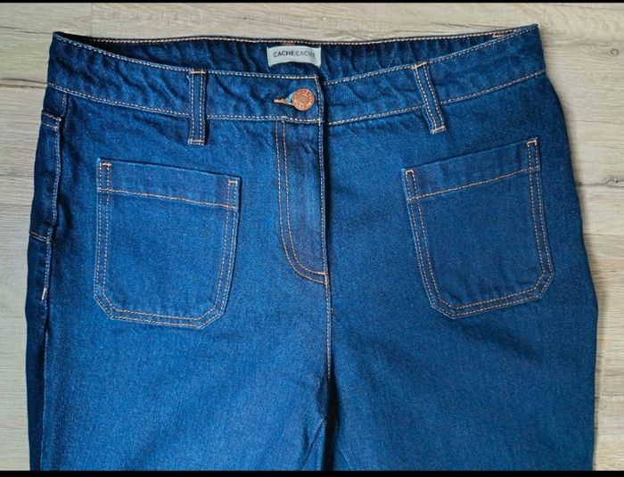 Joli jeans cache cache, T38 deux poches plates carré sur l'avant, et deux sur l'arrière.en parfait état.coupe bootcut Etat neuf. Taille bien voir un peu plus grand.