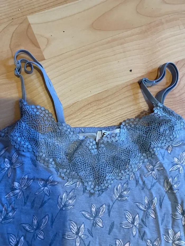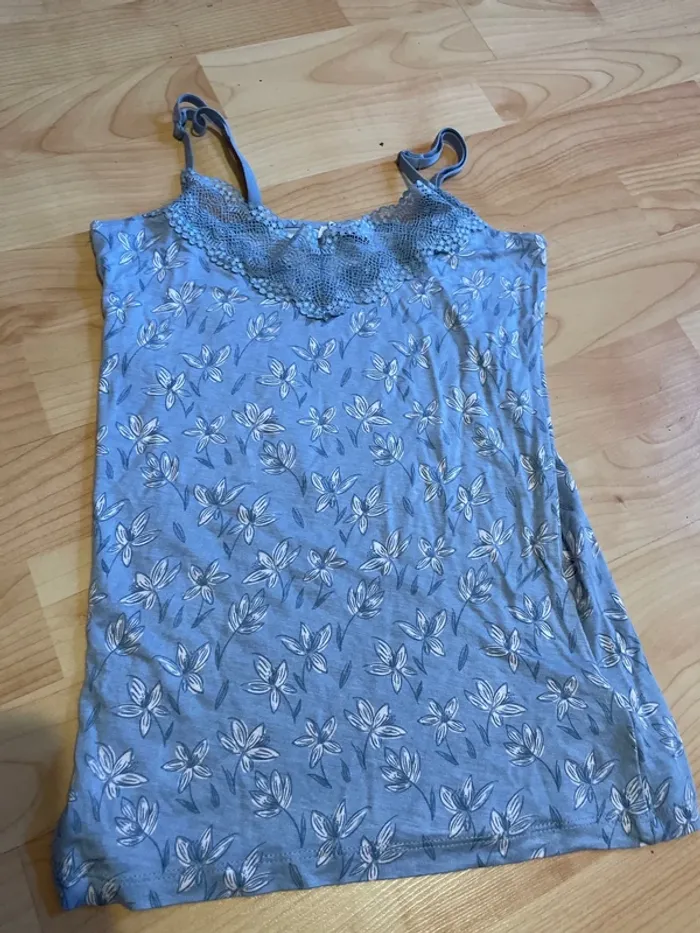 tee-shirt à bretelles bleu ciel à feuilles , viscose/ elasthanne, taille 34 ou XS, marque Etam à dentelle devant