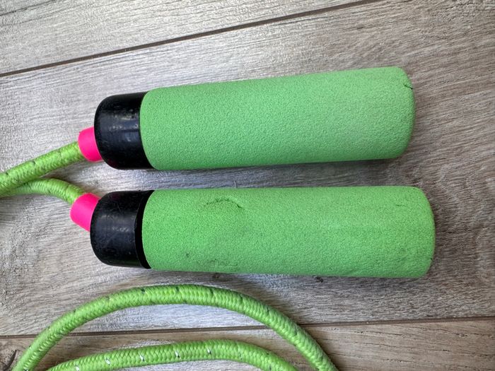Corde à sauter verte Longueur 210 cm En bon état, excepté petit coupure sur l’une des poignées en mousse voir photo CLR