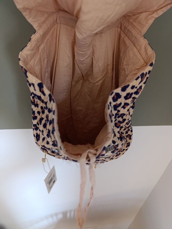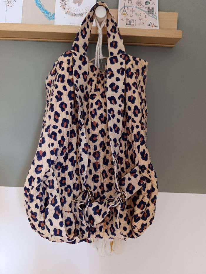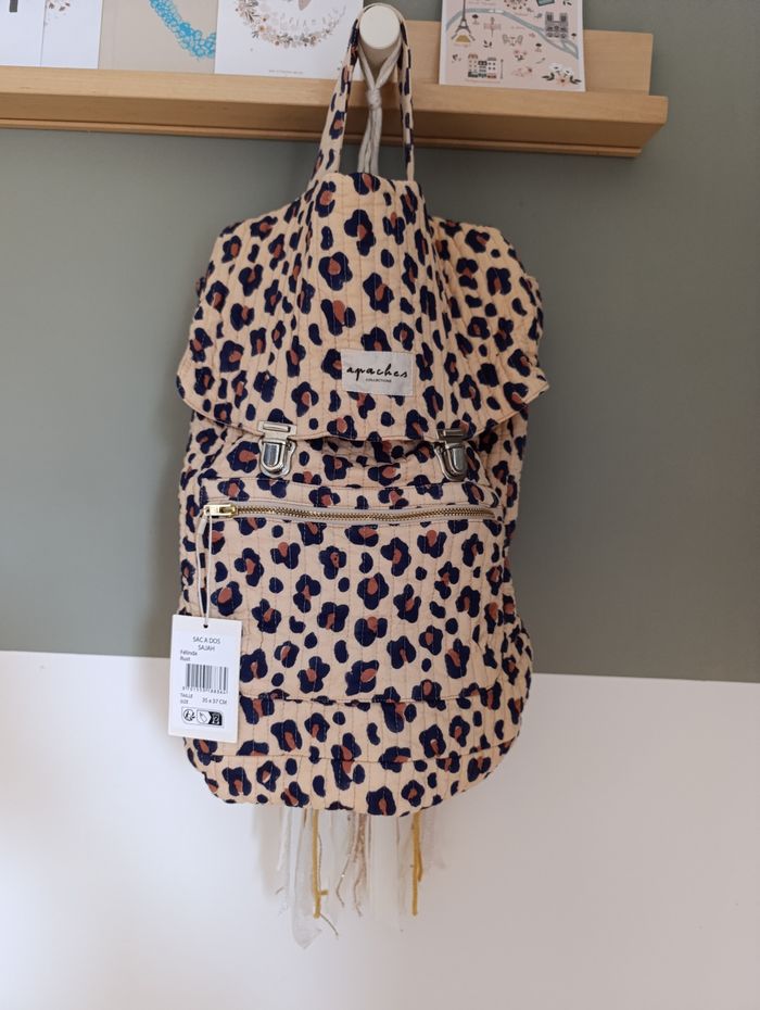 Joli sac à dos Apaches motif léopard graou bleu marine le sac est beige, il est neuf.