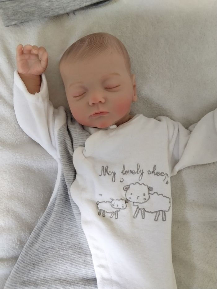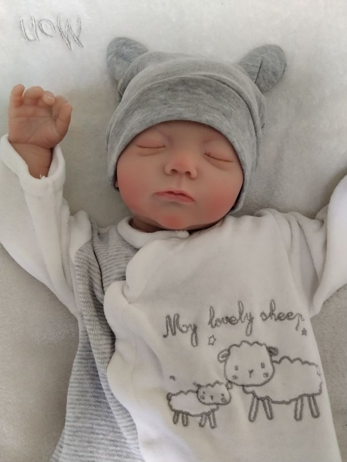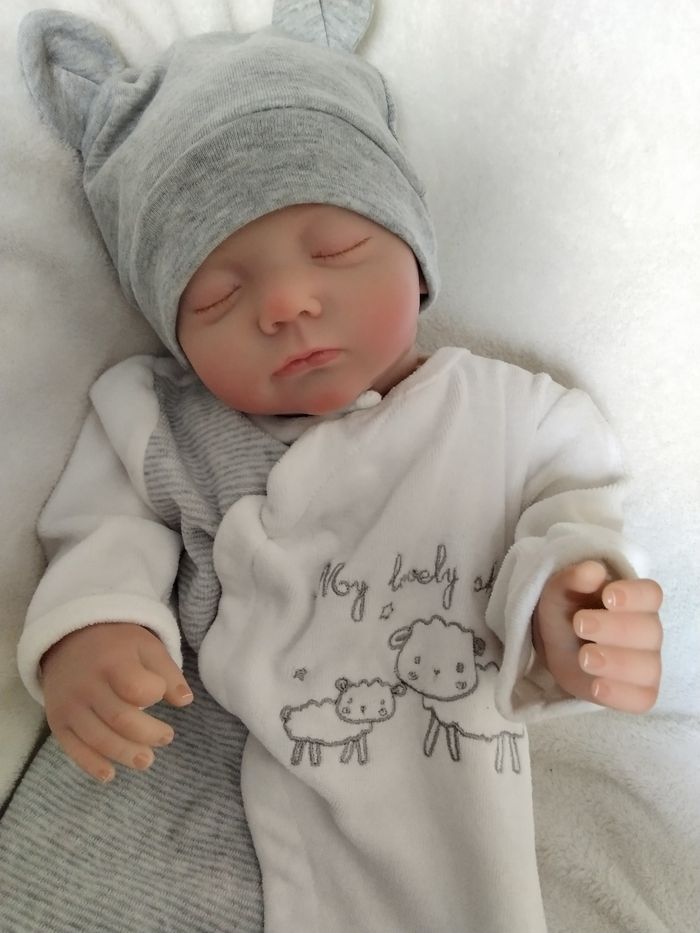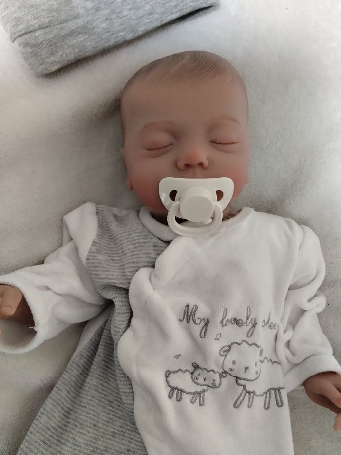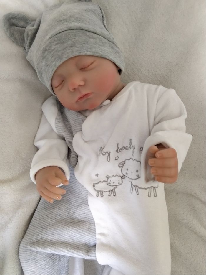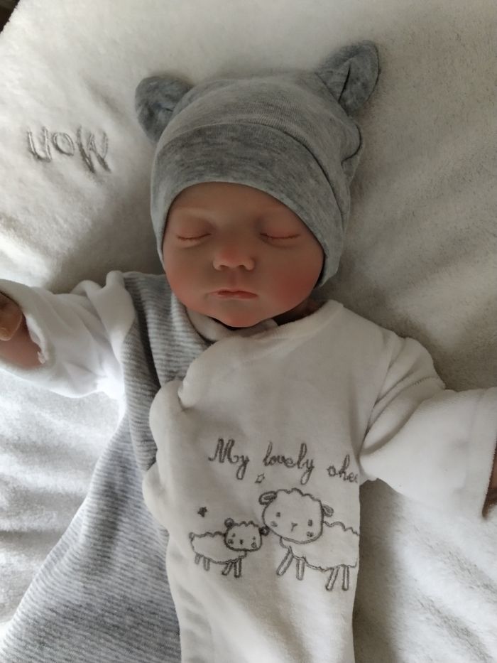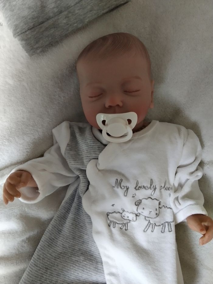 Bébé reborn de 50 cm pour 2 kilos 325 Sa tête tombe légèrement comme un vrai bébé Son corps est en tissu et ses membres en vinyle Le bébé est non sexué il peut donc être un garçon ou une fille au choix Sa bouche est aimantée Il part avec les vêtements et accessoires des photos ainsi qu'un joli petit trousseau