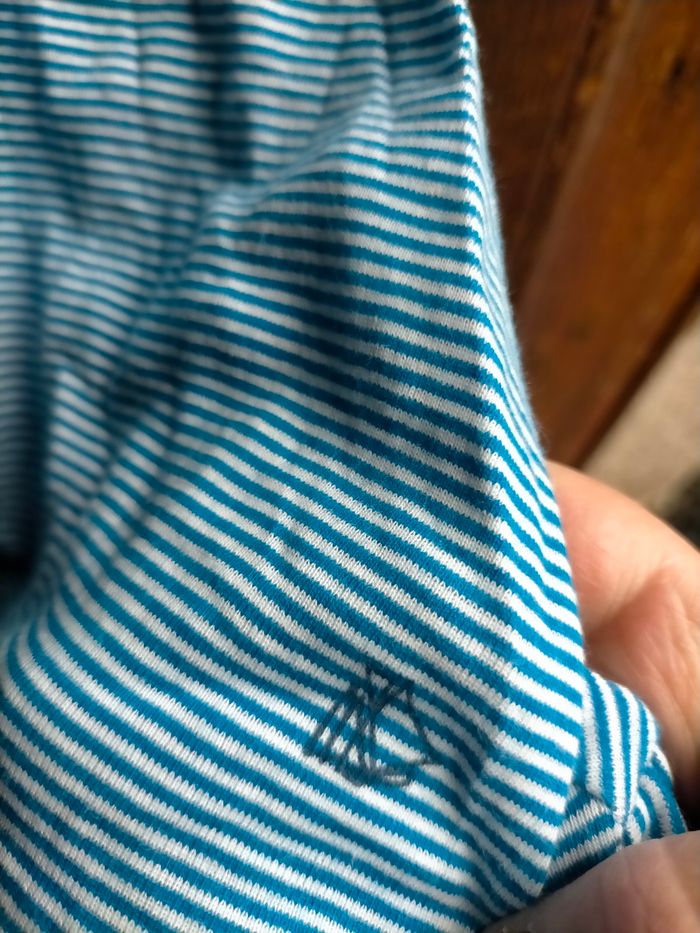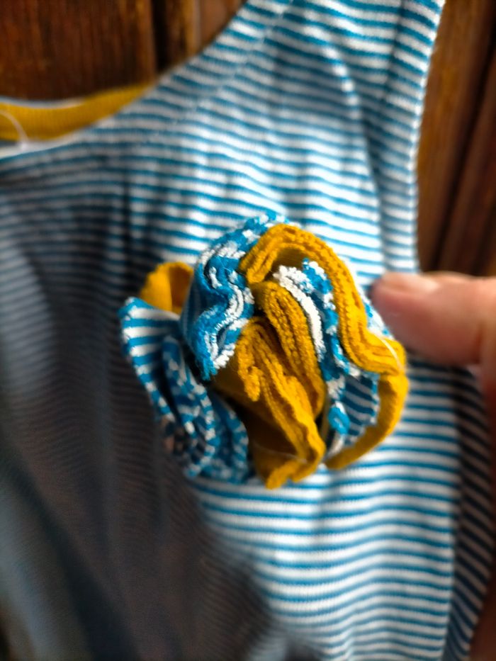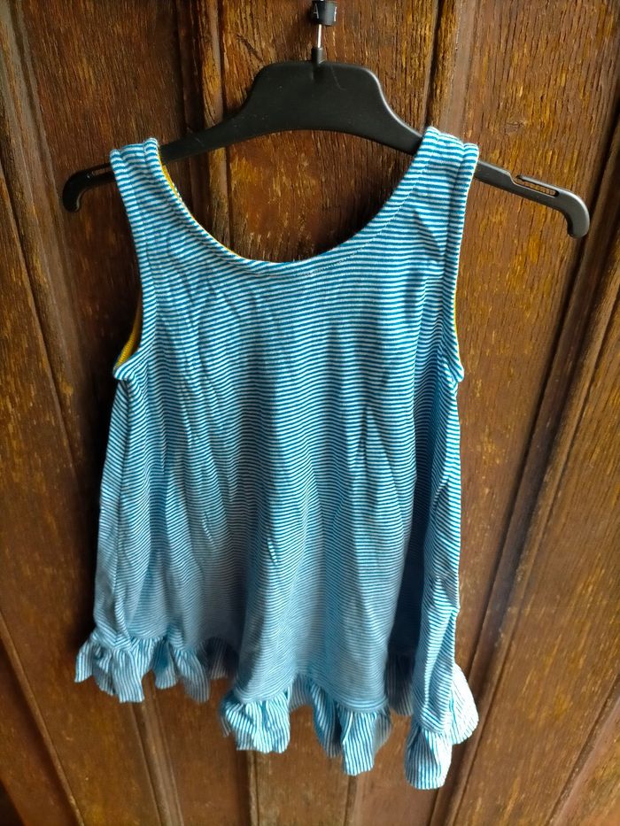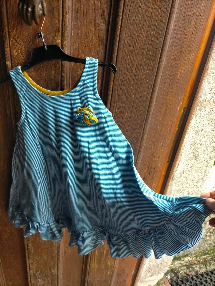 Excellent état. Jolie robe sans manche de forme trapèze en coton bleu rayé blanc. Fleur en 3D avec touche de moutarde volant et petit bateau à la base