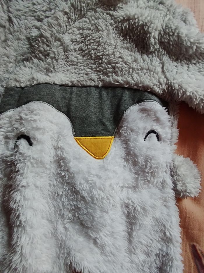 Sur pyjama peluche à capuche, motif petit canard gros blanc et jaune. Très confortable et zippé taille 12 Mois
