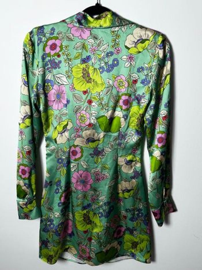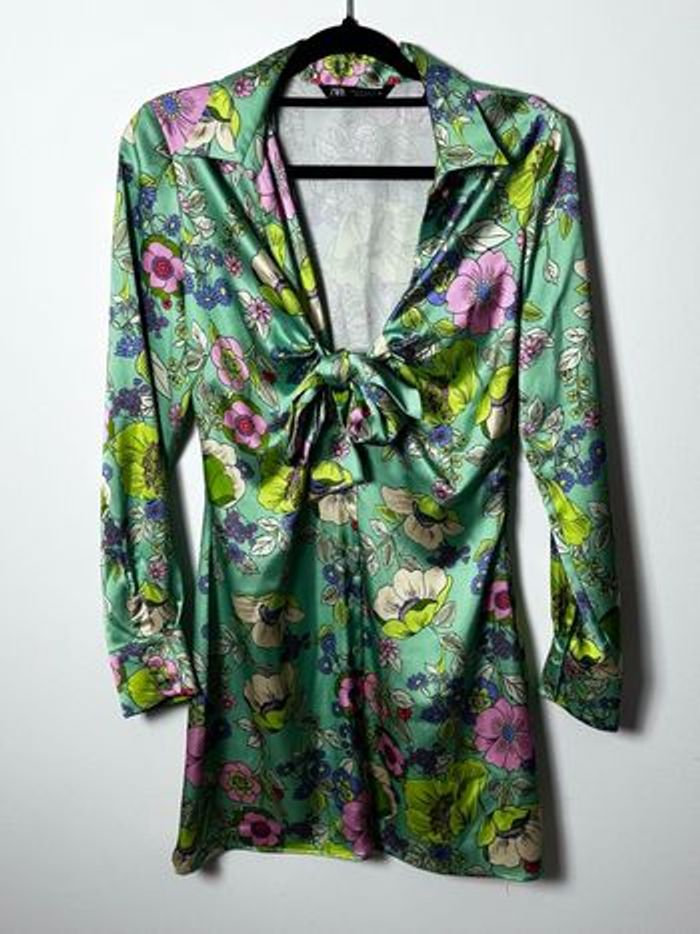 🌸 robe zara verte fleurie esprit rétro chic 🌸 Magnifique robe Zara à imprimé floral vibrant dans des tons vert émeraude, rose et violet. Un vrai esprit rétro chic, parfaite pour le printemps et l’été ou portée avec des bottes pour un look bohème affirmé 💚 Détails Taille S Longueur environ 87 cm Épaules environ 42 cm Largeur aisselles environ 45,5 cm Fermeture éclair discrète sur le côté 97 % polyester 3 % élasthanne Tissu fluide avec un effet satiné qui fait penser à la soie ✨ Très agréable à porter et lumineux. Col chemise, manches longues avec boutons aux poignets, superbe lien à nouer à l’avant qui met la silhouette en valeur. Coupe flatteuse, pièce forte qui ne passe pas inaperçue. Envoi rapide et soigné 📦 Me contacter si besoin. #zara #robefleurie #robeverte #robeboheme #lookretro #modefemme #robep rintemps #tailleS