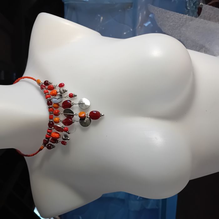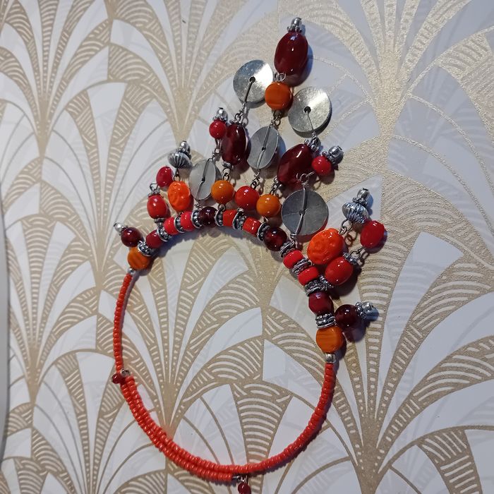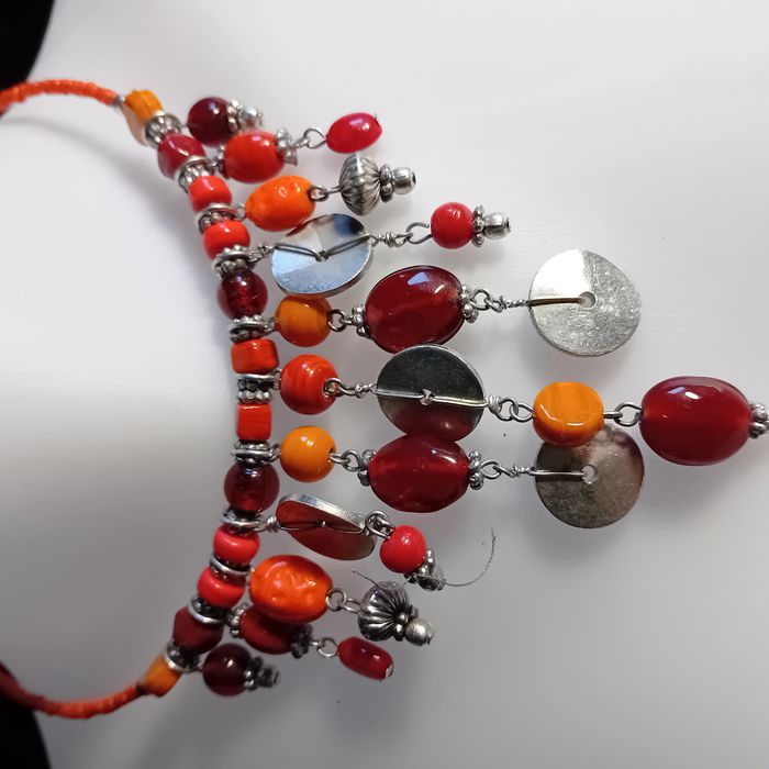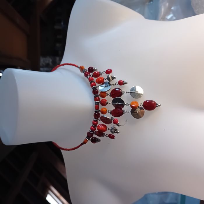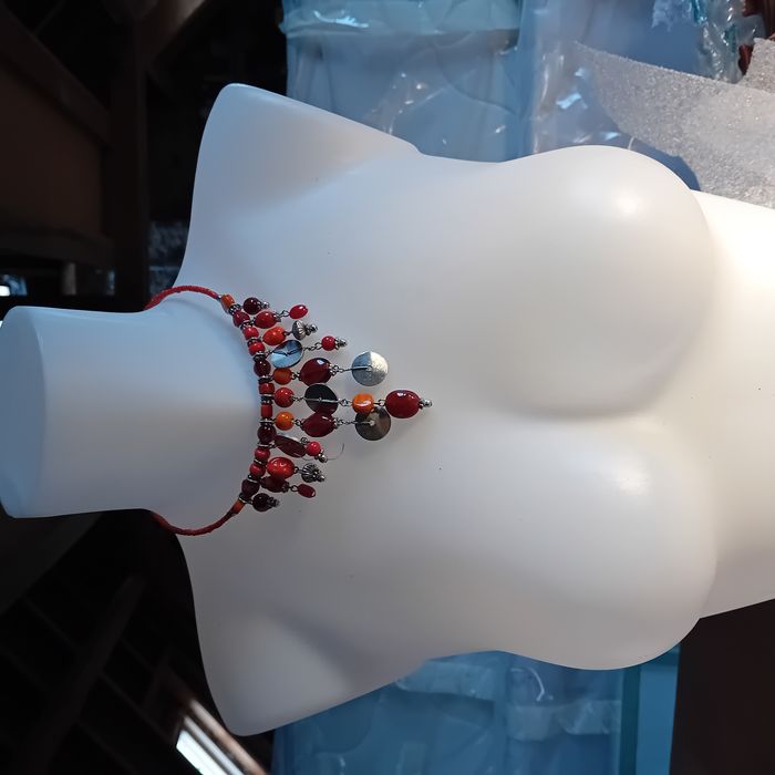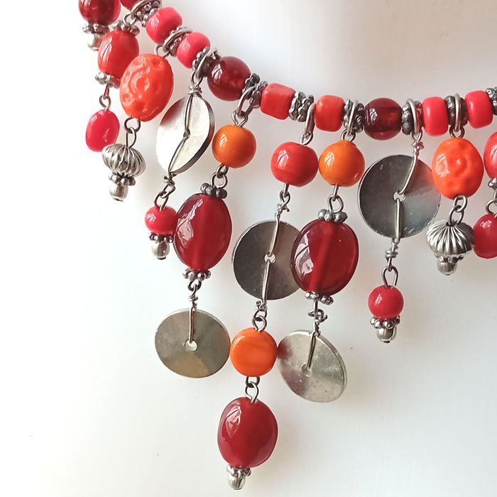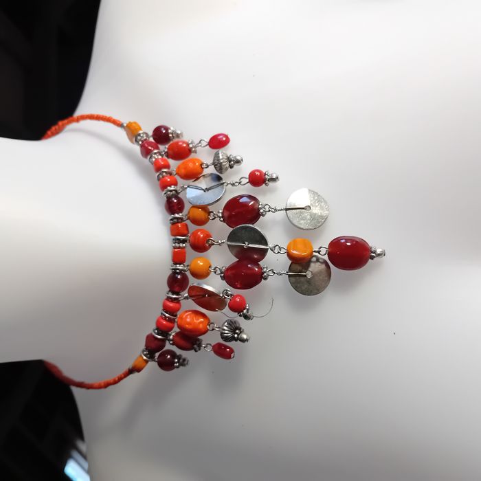 très beau collier ras de cou sur tige extensible perles de verre et sequins de métal très bel effet porté quelques fois mais aucun défaut