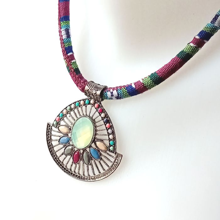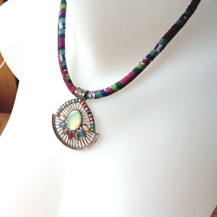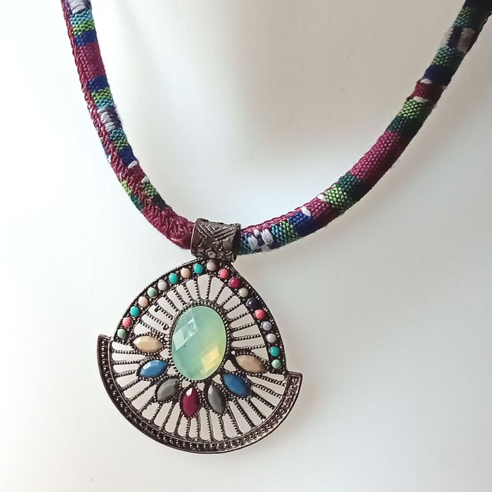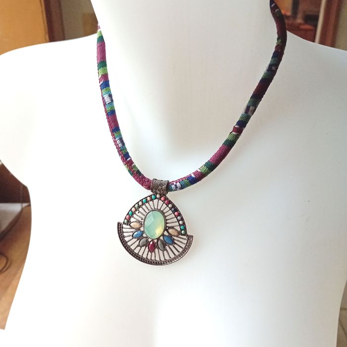 collier tissu washi et pendentif imitation strass porté 1 fois