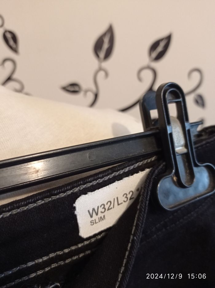 pantalon noir noté W32/ L32 fermé devant par un bouton et une fermeture zippée largeur taille 40 longueur jambe 80 longueur total 107 marqué taille 42 mais voir mesures