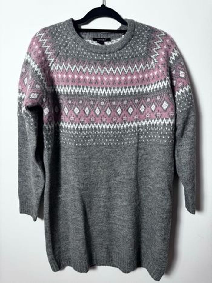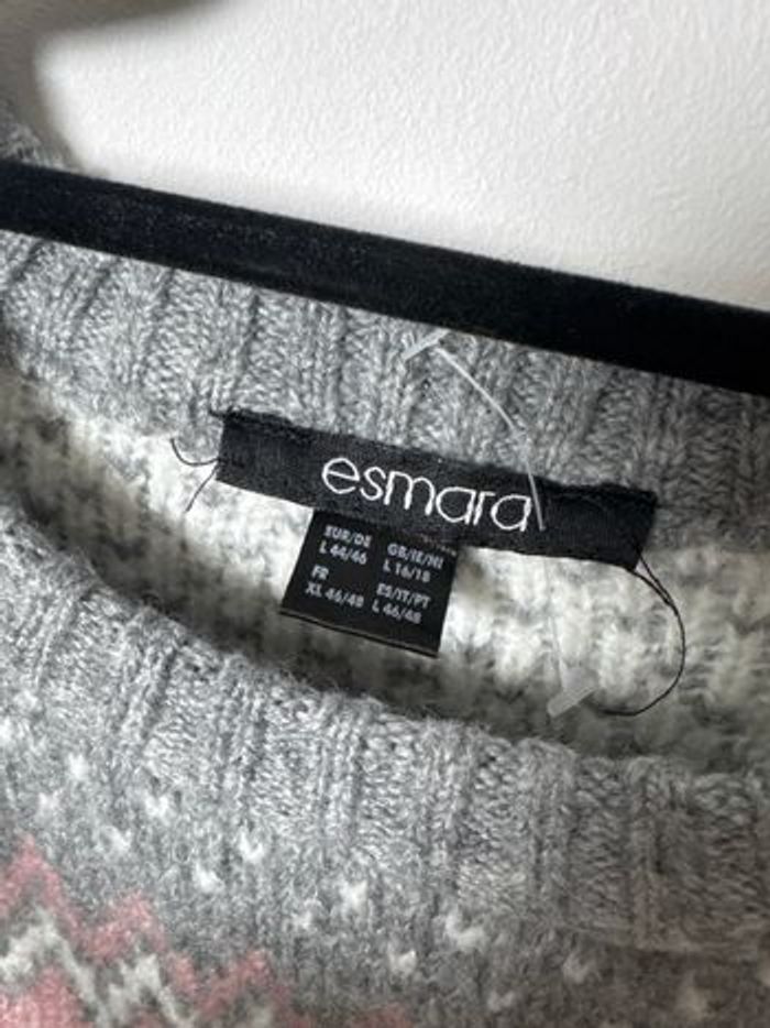 ✨ Robe pull ESMARA gris et rose esprit nordique ✨ Superbe robe pull chaude et confortable, parfaite pour la saison ❄️ Motifs scandinaves gris, rose poudré et blanc, très tendance et faciles à associer. Coupe confortable avec belle aisance, idéale avec collants opaques et bottines pour un look cosy chic, ou en version plus casual avec baskets 🤍 📏 Mesures prises à plat Aisselles 52 cm Longueur 88 cm Taille indiquée XL convient 46 48 🧵 Composition 81 % acrylique 17 % polyester 2 % élasthanne Maille douce, chaude et souple, très agréable à porter au quotidien. Envoi rapide et soigné avec beaucoup d’attention ❤️ Merci de me contacter avant achat si besoin.