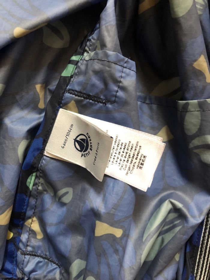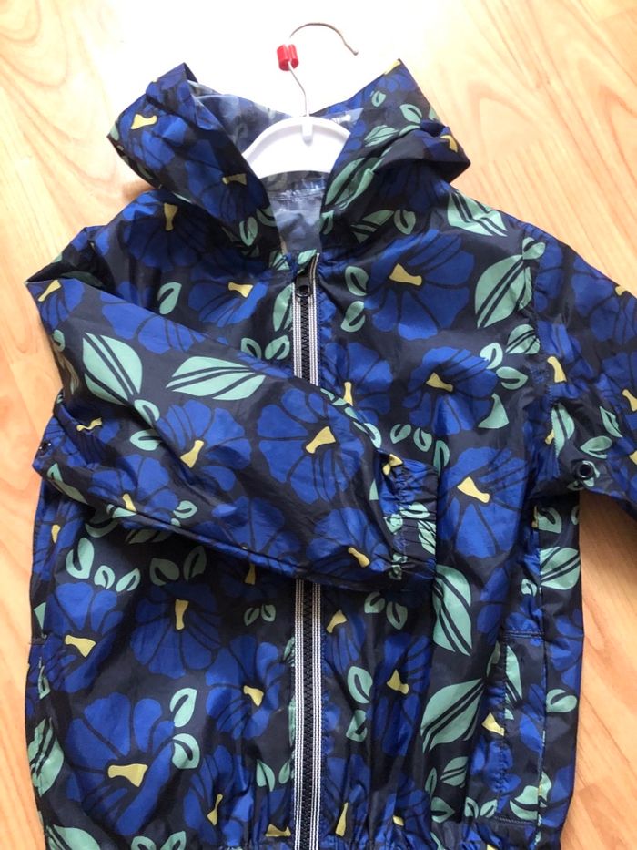 petit bateau, veste enfant, coupe vent, kway, imperméable léger, ciré, capuche, zip, mi saison, automne, printemps, pluie, école, bleu, fleurs, floral, 4 ans, 104 cm, garçon, fille, mixte