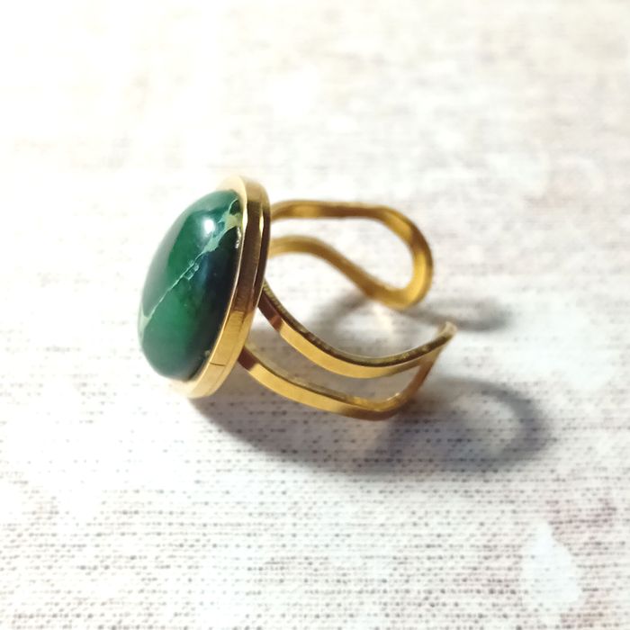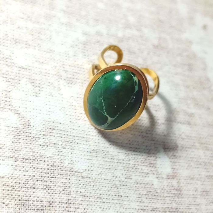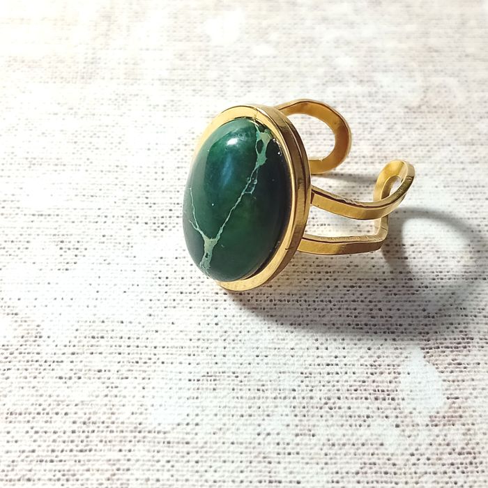 bague acier inoxydable dorée pierre naturelle verte marbrée hauteur 2 cm portée 1 fois