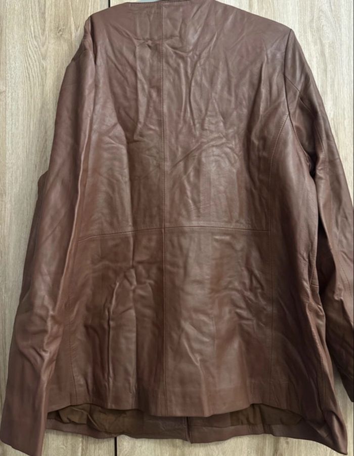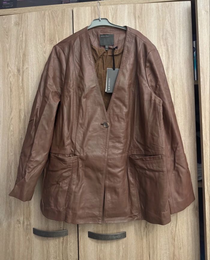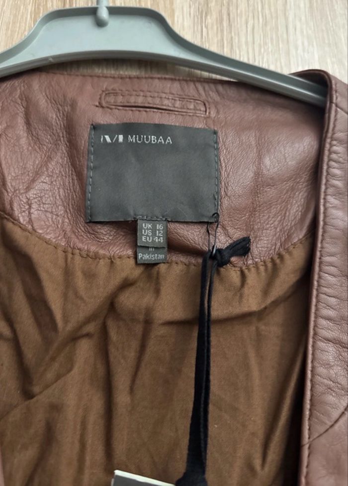 Magnifique veste en 100% cuir d’agneau véritable, couleur chocolat 🤎 Marque Muubaa – qualité premium. ✔ Taille UK 16 (équivalent EU 44) ✔ Doublure 100% coton ✔ Neuve avec étiquette et emballage d’origine ✔ Cuir souple et très agréable à porter ✔ Coupe élégante, intemporelle Parfaite pour un look chic ou casual. Prix boutique très élevé – excellente affaire ici ✨ Envoi rapide et soigné.