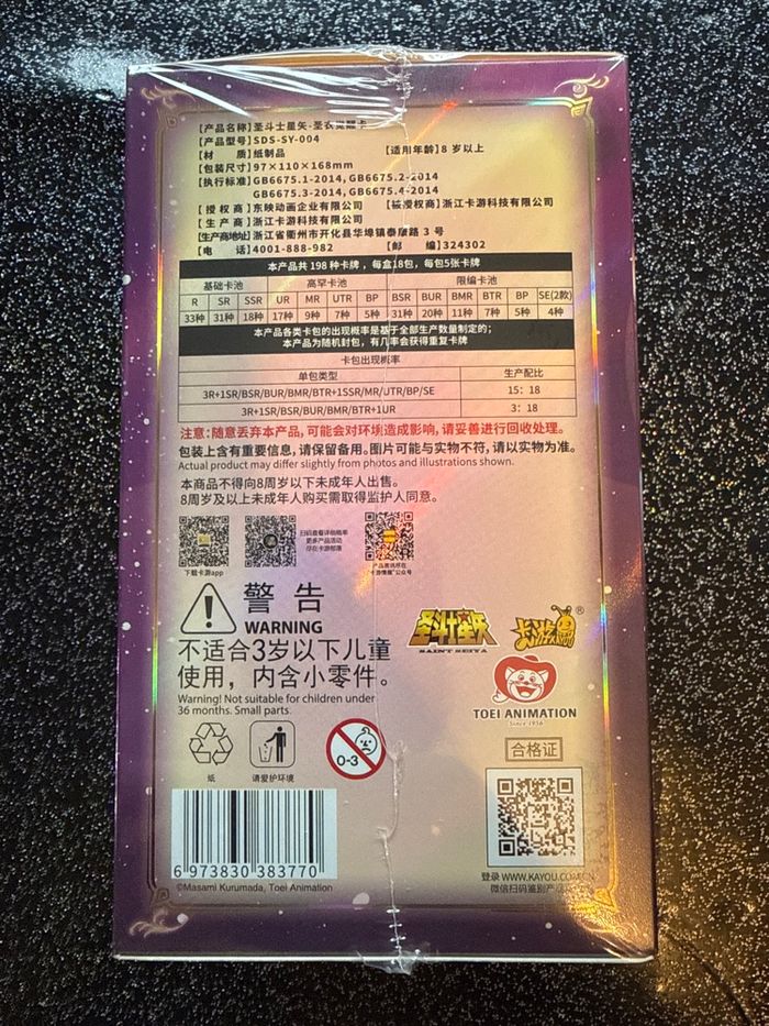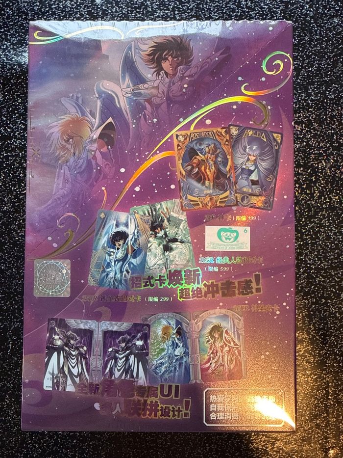 Kayou propose sous licence officielle des cartes à collectionner Saint Seiya. 1 display = 18 boosters 1 booster = 5 cartes Possibilité d'acheter au booster (voir autres articles) Saint Seiya : La Puissance des Chevaliers du Zodiaque Plongez dans l’univers mythique des Chevaliers du Zodiaque avec la Wave 4 de la collection officielle Kayou. Cette nouvelle série sublime rend hommage aux héros légendaires de l’anime, avec des cartes à l’esthétique exceptionnelle et des finitions haut de gamme. ✨ Ce qui vous attend dans la Wave 4 : Un Display de 18 boosters, chacun contenant 5 cartes aléatoires. Des raretés exclusives, les BP et les très convoitées SE. La possibilité de retrouver non seulement les cartes inédites de la Wave 4, des cartes rares numérotées (BSR, BUR, BMR, BTR, BP, SE) mais aussi (UR, MR, UTR, BP). Des illustrations spectaculaires, des effets visuels holographiques et des finitions premium qui font de chaque carte une véritable pièce de collection. Ce produit est en chinois car la licence Kayou Card Saint Seiya est actuellement distribuée seulement en Chine. Tous les produits Kayou Card sont donc en chinois et cela s'applique évidemment à toutes les cartes Kayou Saint Seiya.