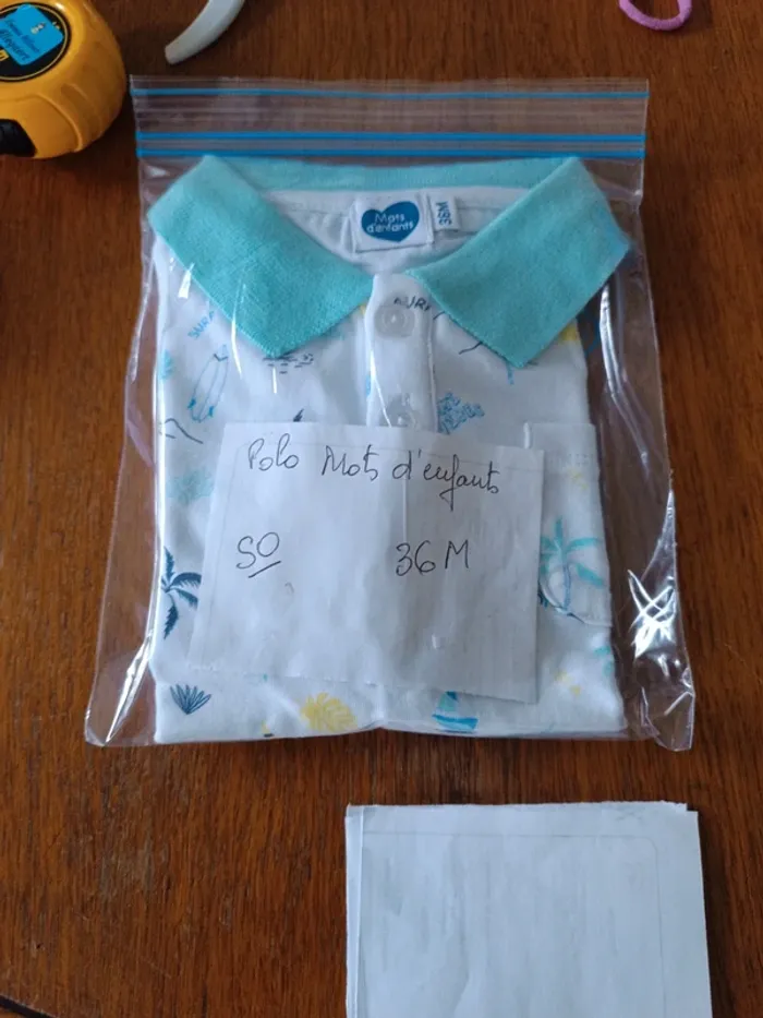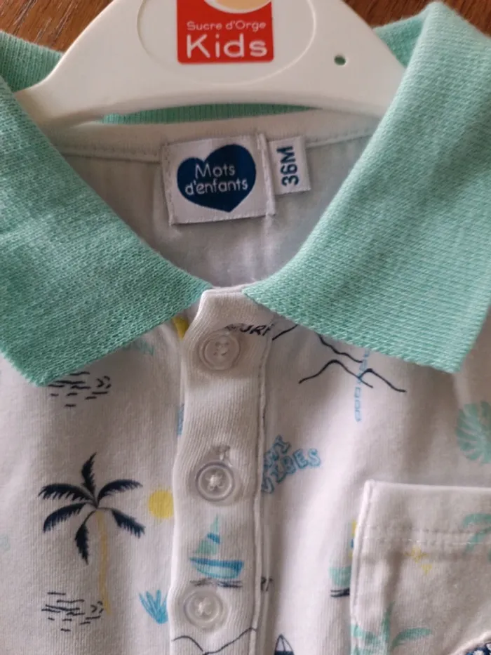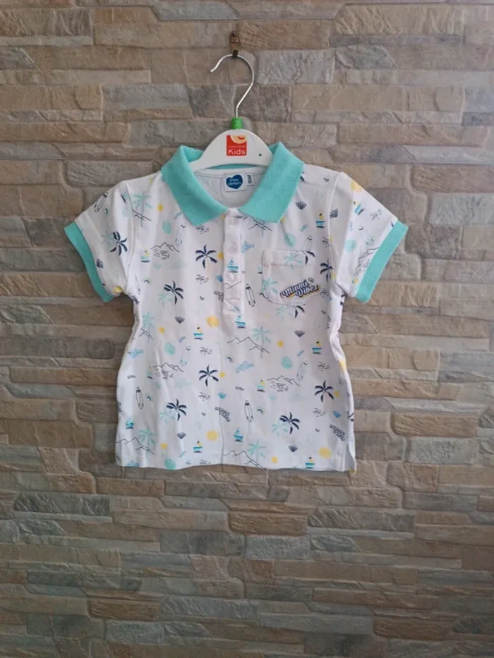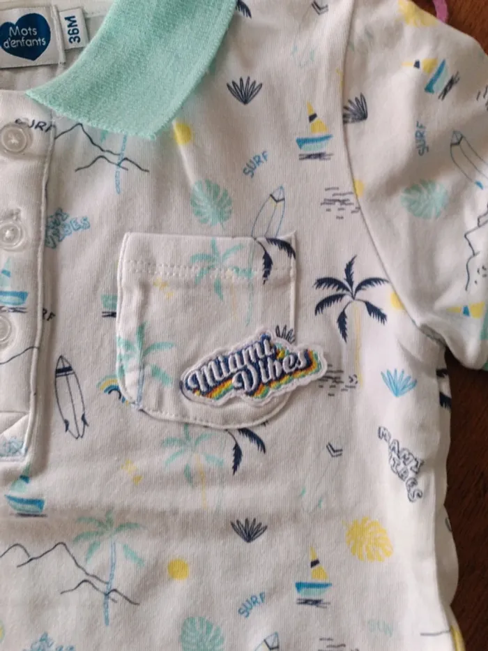 Polo surf Mots d'enfants 36M. Blanc, turquoise. 95% coton, 5% élasthanne. Neuf