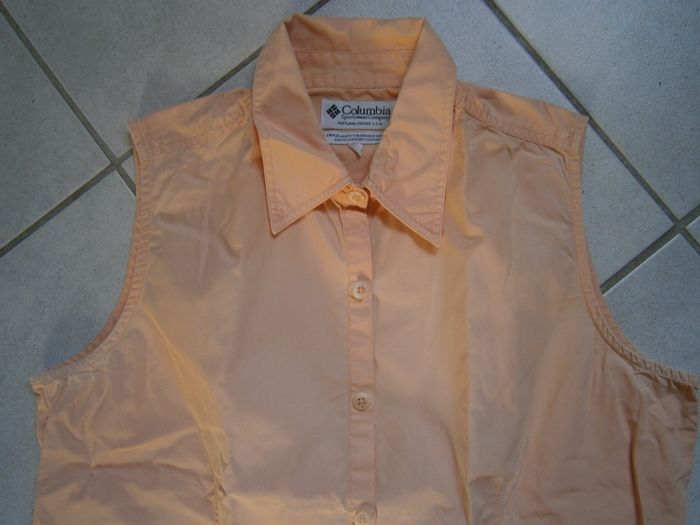 Chemisier sans manches. Couleur corail/orange. Marque COLUMBIA. Boutons devant. Forme arrondi en bas du vêtement. Pli devant. 100% coton. Dimension : Tour de poitrine = 106 cm. Taille 42.