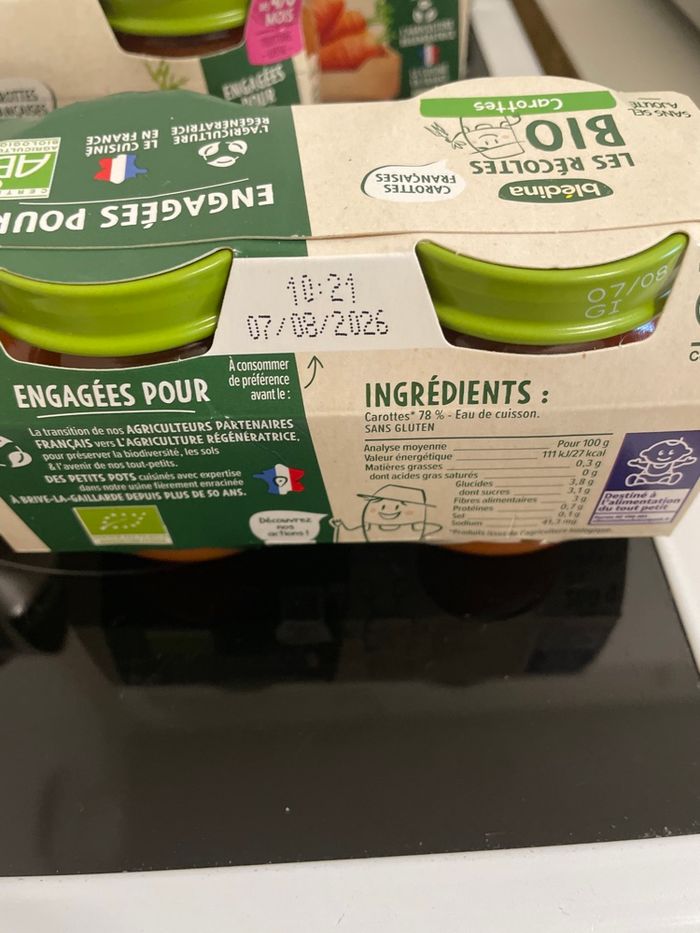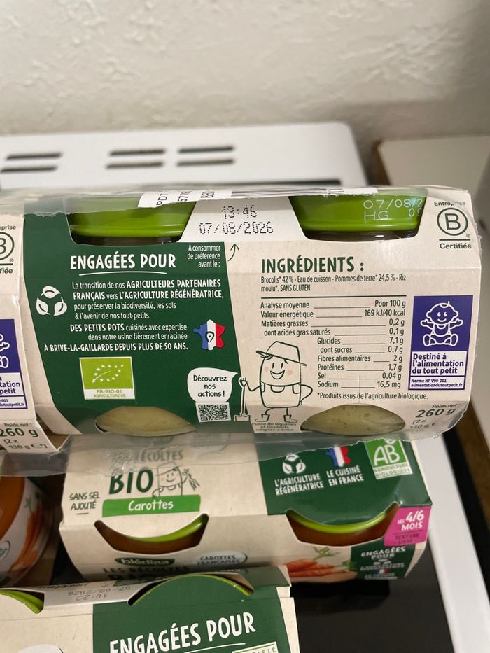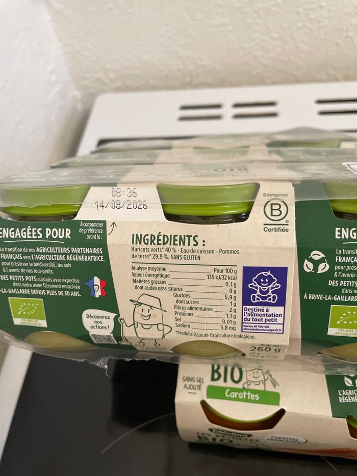 Ce lot contient 12 petits pots brocolis et pomme de terre (07/08/2026) 12 petits pots haricots verts pomme de terre (14/08/2026) 20 petits pots carotte (07/08/2026) Poids du colis 5kg720