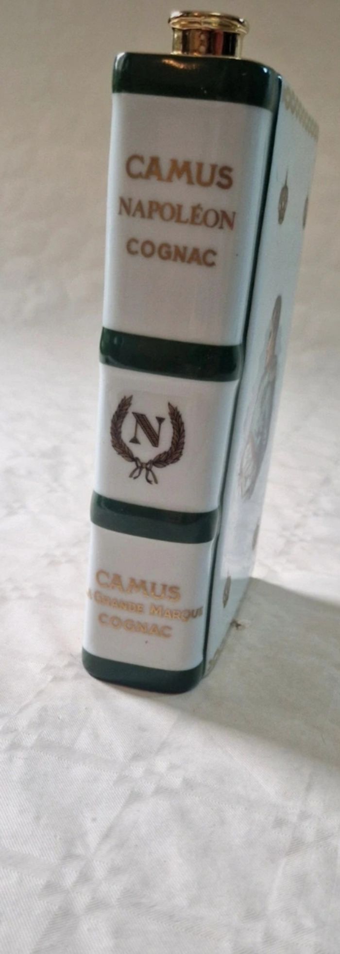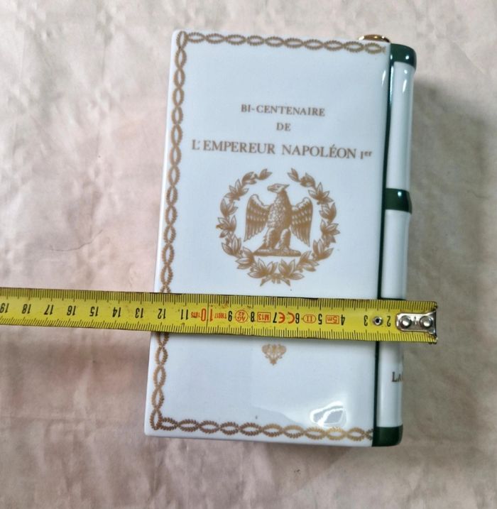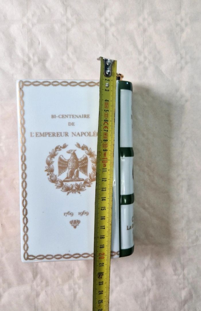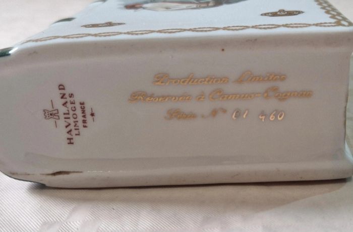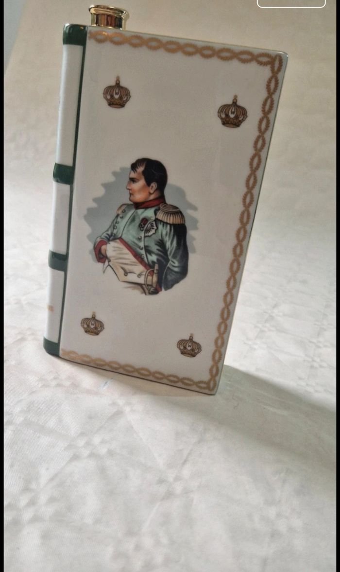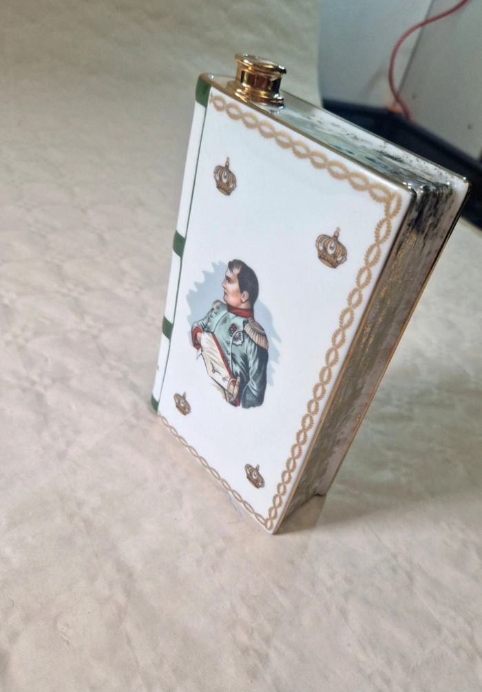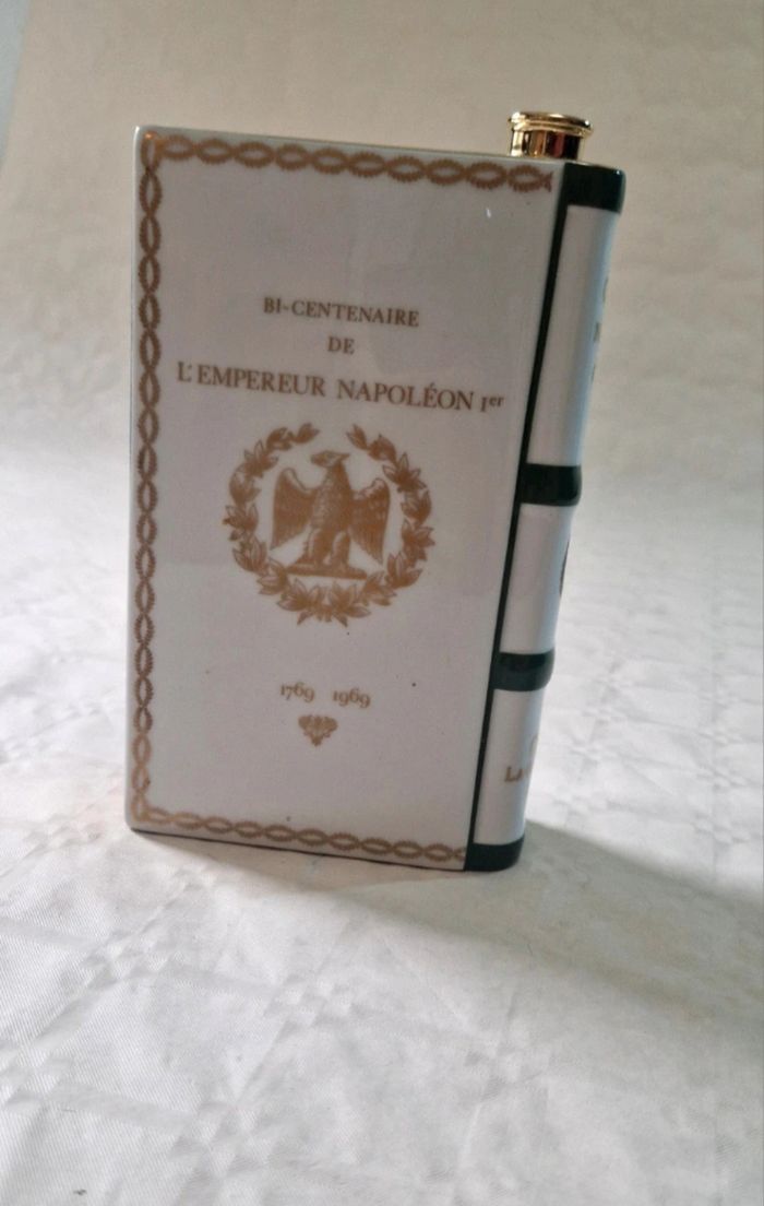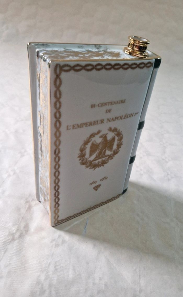 Bonjour, ​Flacon de collection en porcelaine de Limoges (maison Haviland) en forme de livre, édité pour le Bi-centenaire de l'Empereur Napoléon 1er (1769-1969) pour Camus Cognac. ​Ce modèle blanc est orné de dorures représentant l'aigle impérial et un buste de l'Empereur. Marquage "Production Limitée" avec le numéro de série 01 460 sous la base. ​Très bon état général. ​sans bouchon . La porcelaine ne présente aucun éclat. Dimensions : environ 19 cm de hauteur pour 12 cm de largeur. ​Matière : Porcelaine Haviland Limoges France ​ #camus #napoleon #cognac #limoges #haviland #collection #empire #porcelaine