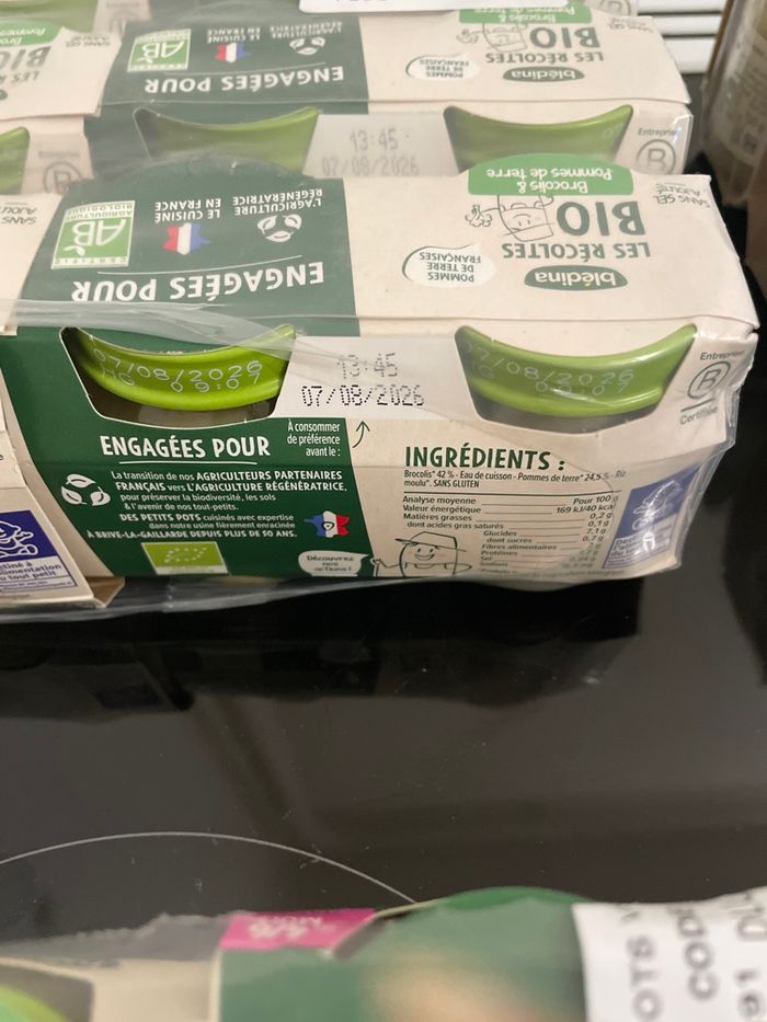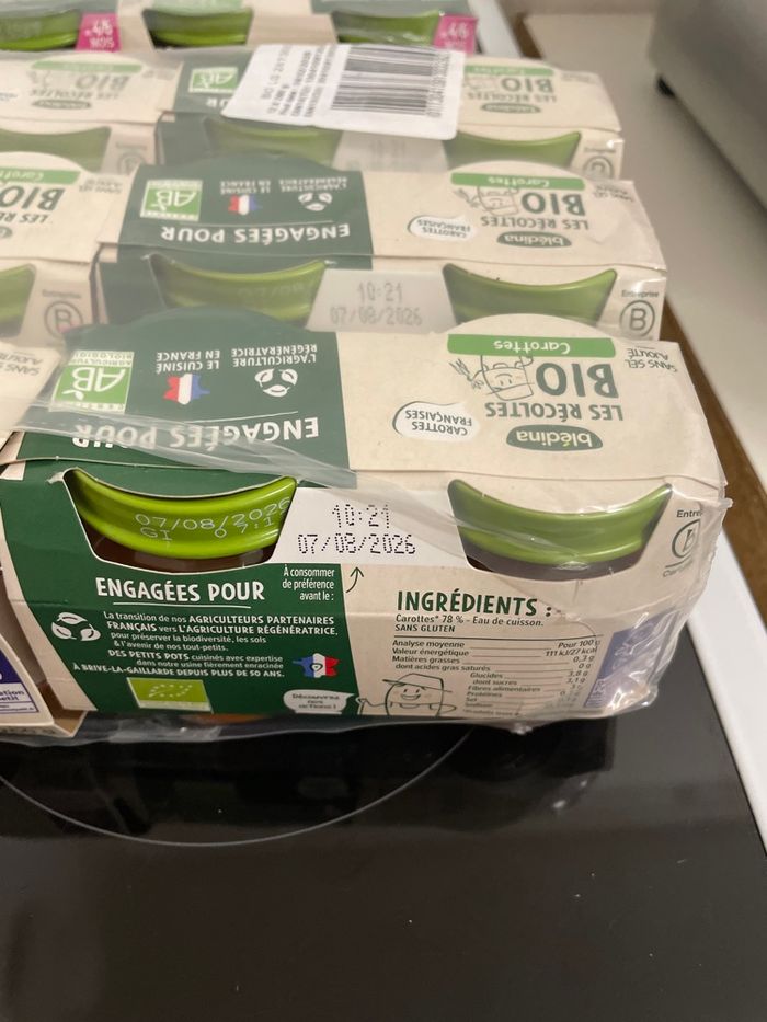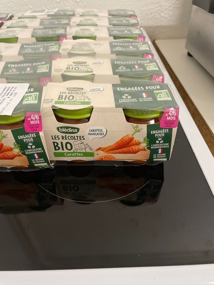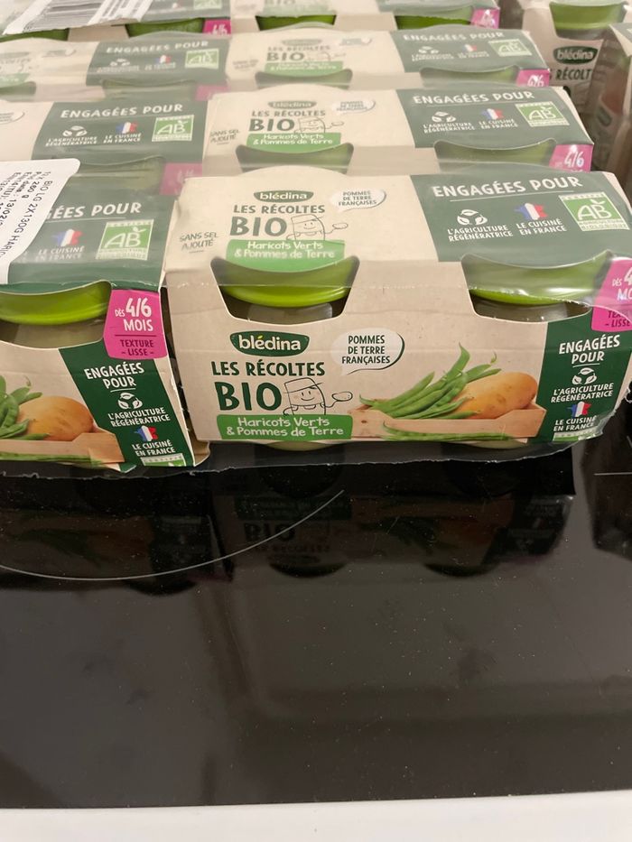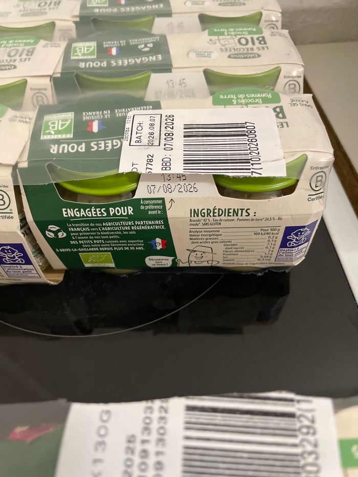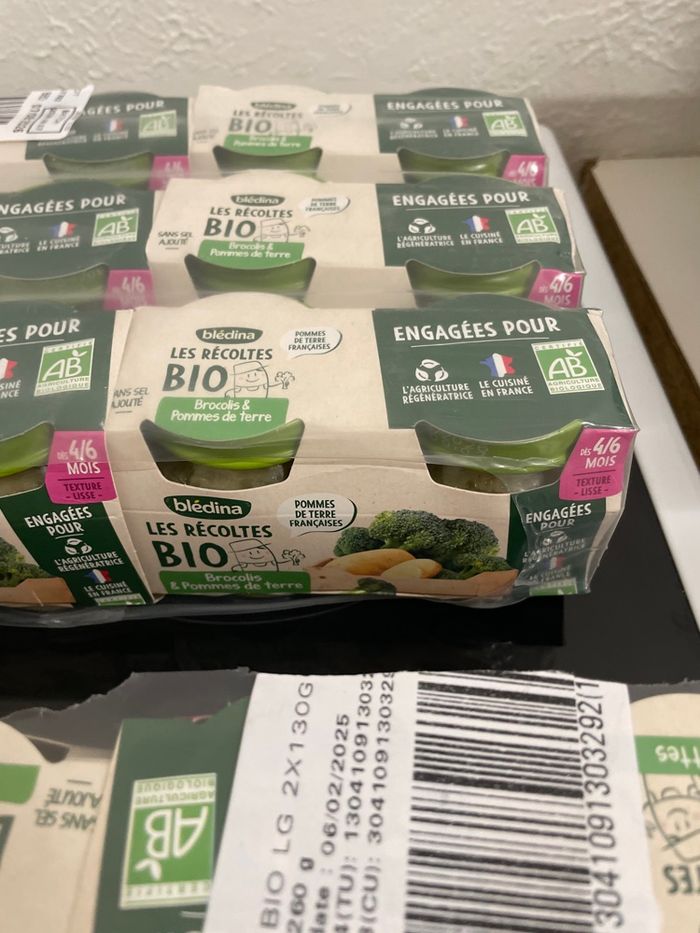 Ce lot contient 12 petits pots haricots verts pomme de terre (14/08/2026) 12 petits pots carotte ( 07/08/2026) Et 24 petits pots brocolis pomme de terre (07/08/2026) Poids du colis 6kg240