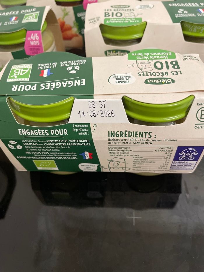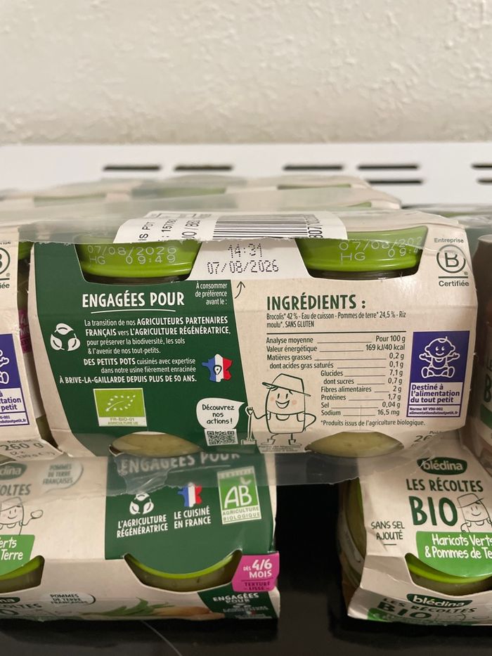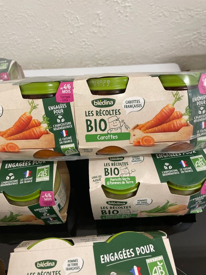 Ce lot contient 12 petits pots carotte (07/08/2026) 12 petits pots brocolis pomme de terre (07/08/2026) Et 12 petits pots haricots verts pomme de terre (14/08/2026) Poids du colis 4kg680