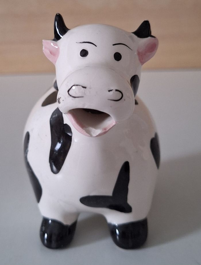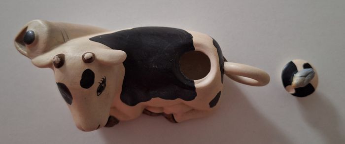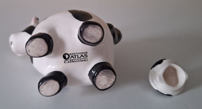 Une vache blanche et noire debout "Editions Atlas" de 11 cm de haut, elle a un petit éclat à la bouche. Une vache crème et noire couchée, sans marque, de 7 cm de haut, elle a un petit éclat sur le couvercle. Les deux sont creuses, elles ont un couvercle et un bec verseur.