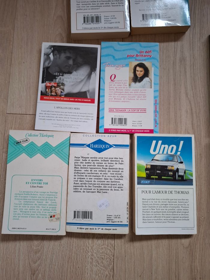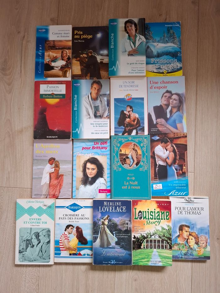 Mini prix pour ce lot de 17 romans car un peu jaunis mais bon état général (différentes collections Harlequin, Nous Deux,..)