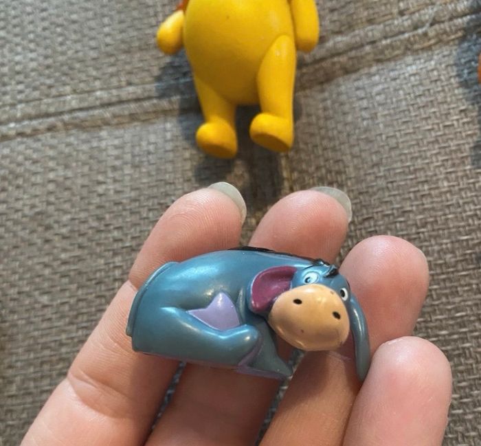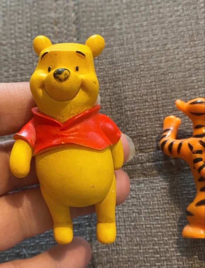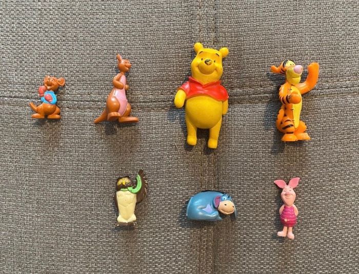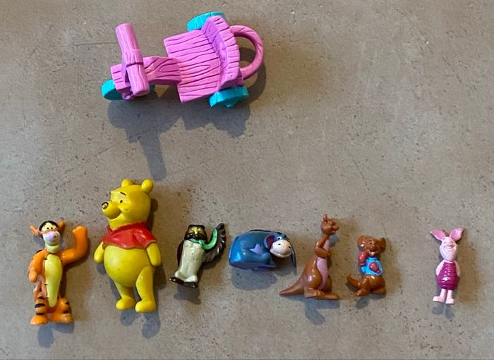 Lot de 8 figurines du monde dessin Winnie l’ourson - Winnie - Tigrou - Bourriquet - Porcinet - Maitre hibou - Maman et petit Gourou - tricycle Il y a plusieurs marques : Disney, kinder.. Vous achetez ce que vous voyez sur les photos