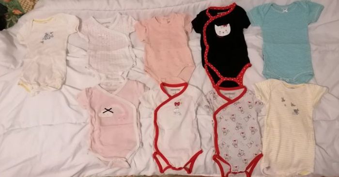 Lot de 17 bodies manches courtes, taille 3 mois, différentes marques, de bon état à très bon état.