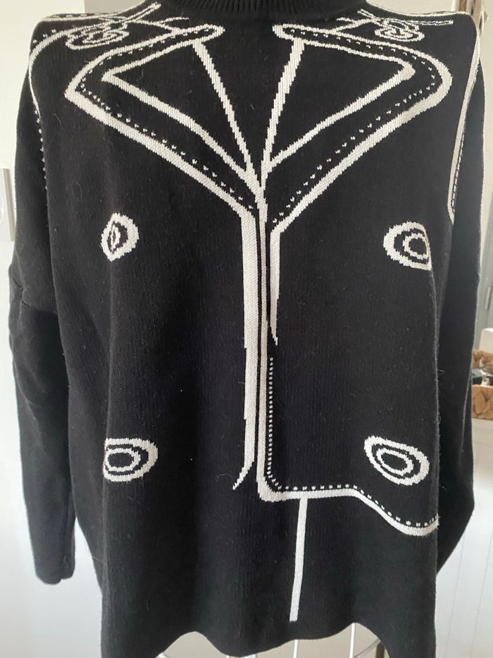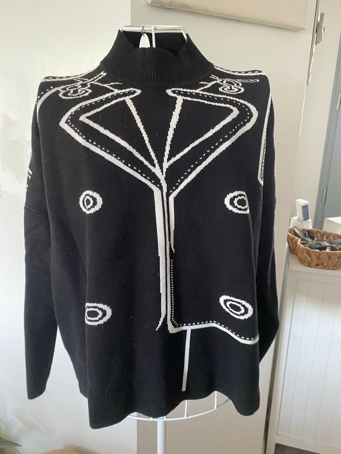 Joli pull noir et blanc avec motif stylé. Mailles épaisses. Col cheminée. Très bon état, aucun défaut.