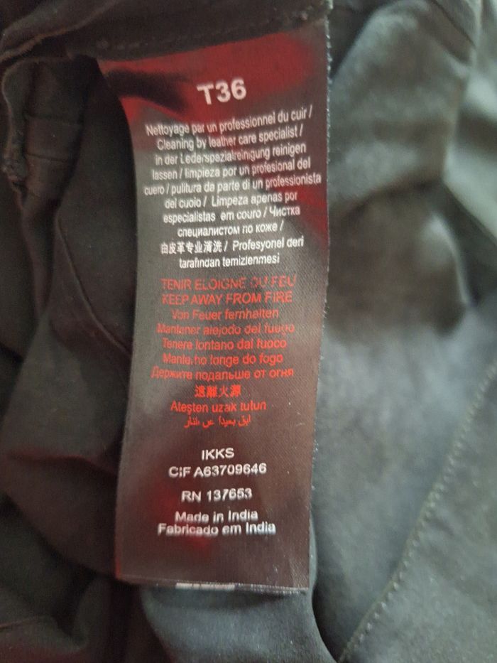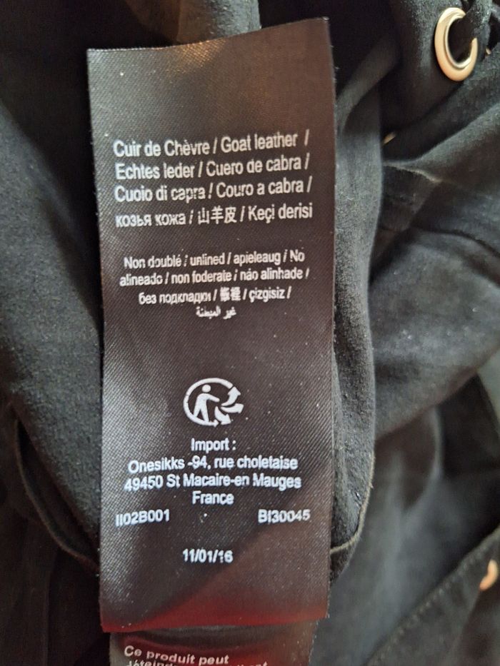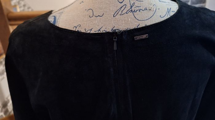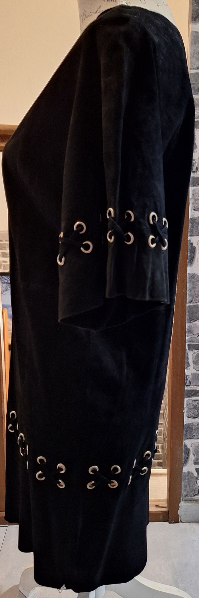 Robe en cuir de chèvre noire uni avec des oeillets dorés sur les manches et dans le bas de la robe. Ces oeillets sont lacés entre eux. Elle est zippée au dos et il y a une petite plaque métallique de la marque à la nuque. Elle est très douce au toucher. Elle mesure 83 cm de hauteur. Elle nécessite un entretien adapté qui la rendrait parfaite.