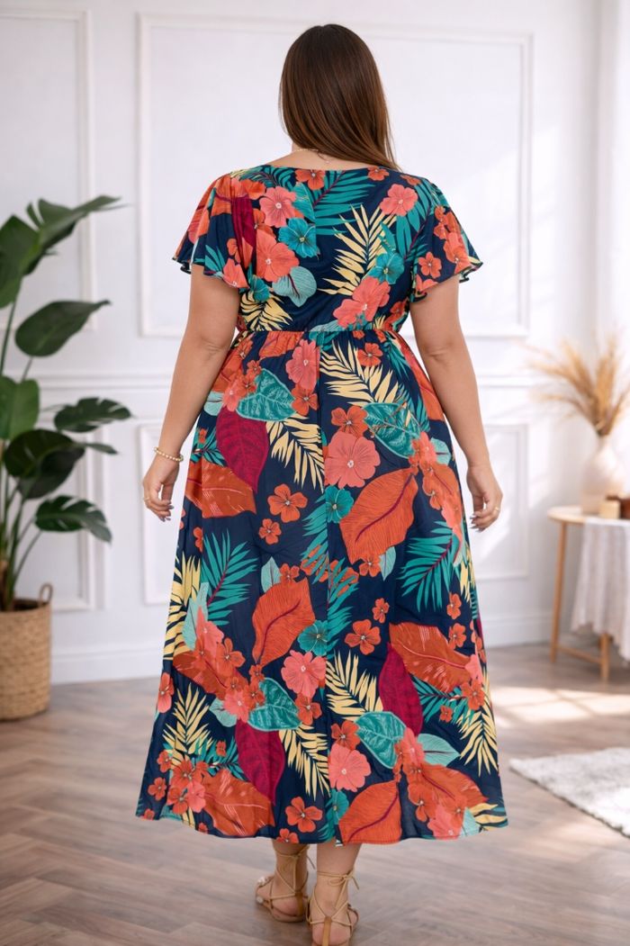 Robe longue nuit tropicale exotique marine et multicolore Femme taille 54 ✴️ Décolleté cache-cœur ✴️ Taille élastiquée froncée ✴️ Manches courtes volantées papillon ✴️ Coupe fluide et aérienne arborant un motif luxuriant de grandes feuilles de palmier et de fleurs exotiques dans des teintes harmonieuses de rouge corail, jaune moutarde, jaune ensoleillé vert émeraude, fuchsia et une petite touche de bordeaux sur un fond bleu marine profond. ✴️ Composition -> 100 % polyester ✴️ Longueur > 136 centimètres ✴️ Mesure épaules à épaules -> 47,5 centimètres ✴️ Tour de poitrine => 140 centimètres