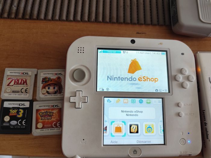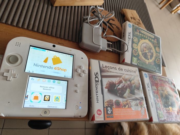 Nintendo 2 est en bon état avec 7 jeux Mario, zelda, toy's stories 3, pokémon, leçon de cuisine, boîte Pandore, destin perdu