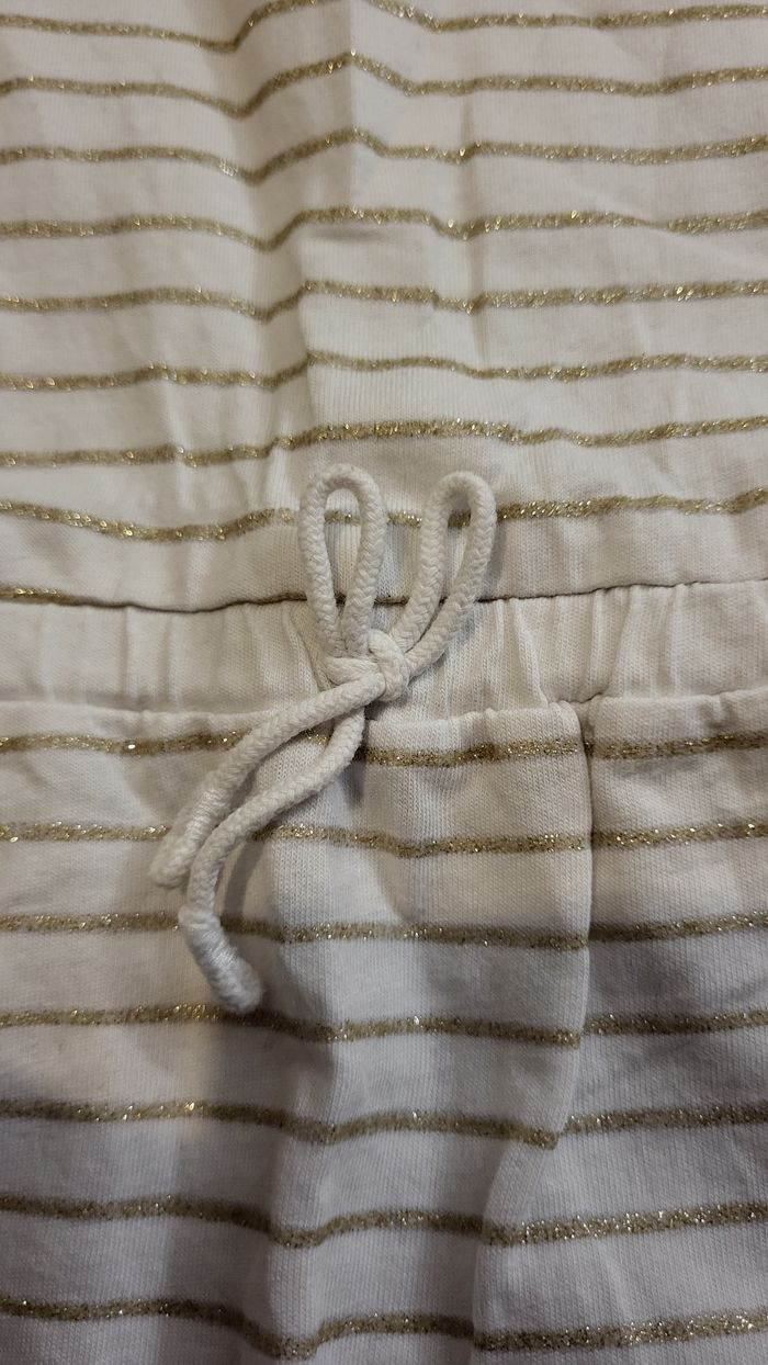 Robe bébé manches courtes – 9 mois (KIABI – coton bio) 100% coton issu de l’agriculture biologique. Couleur crème avec rayures dorées pailletées. Manches courtes, taille élastique avec petit lien décoratif. Boutons dans le dos pour un habillage facile. Très bon état. #kiabi #ecodesign #robebébé #bébéfille #9mois #100coton #manchescourtes #étébébé #modebébé #beebs #petitprix