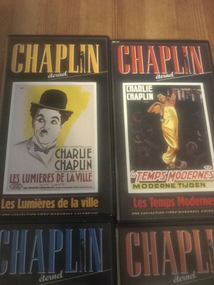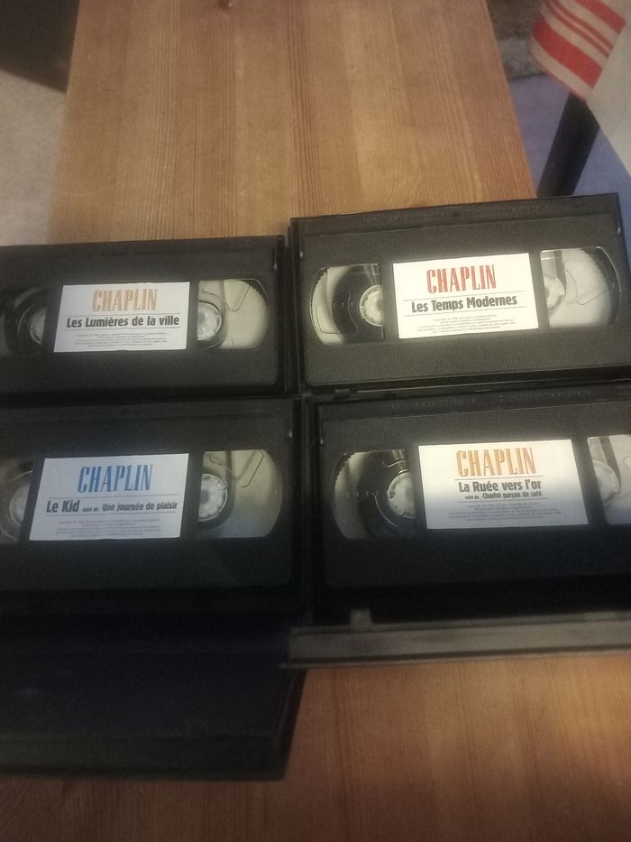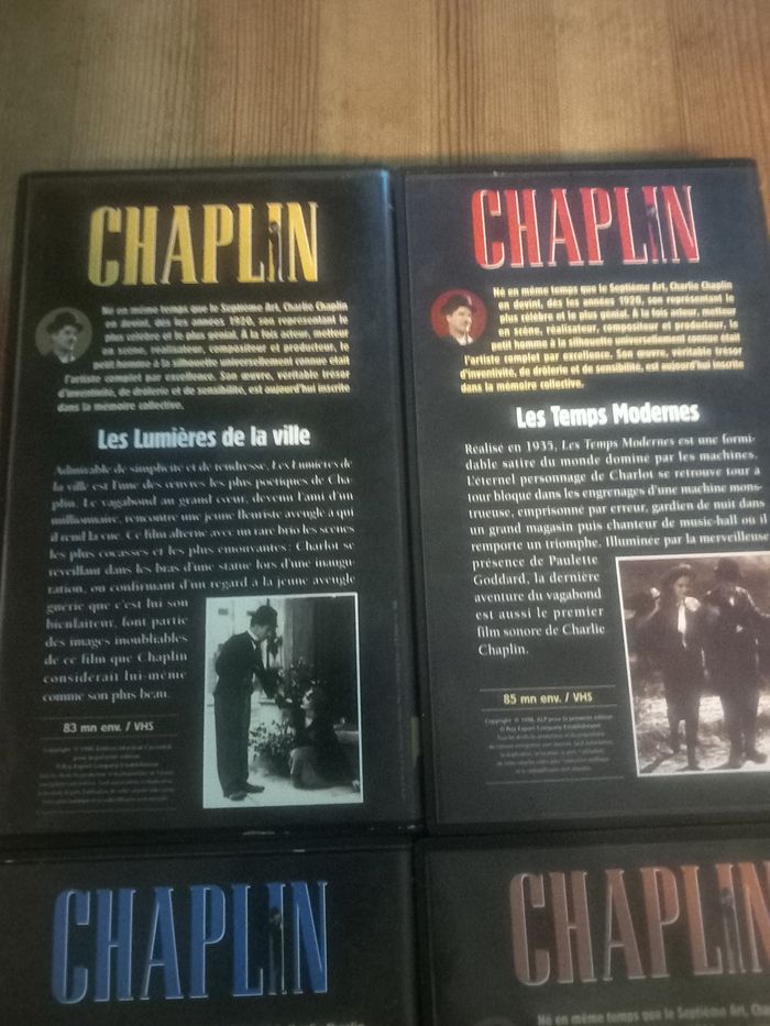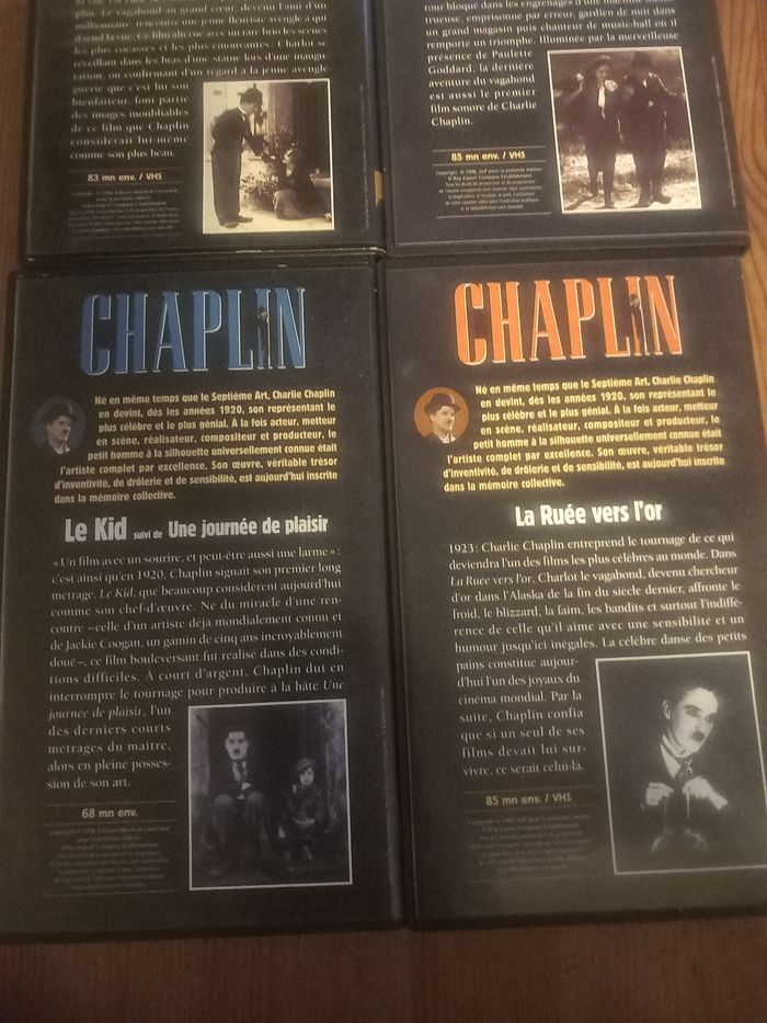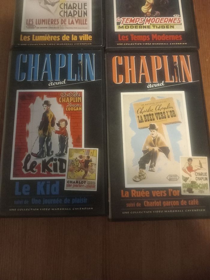 4 VHS films avec Charlie Chaplin 1 : La ruée vers l'or suivi de Charlot garçon de café 2 : Les temps modernes 3 : Le kid suivi de une journée de plaisir 4 : Les lumières de la ville En bon état 2€ les 4