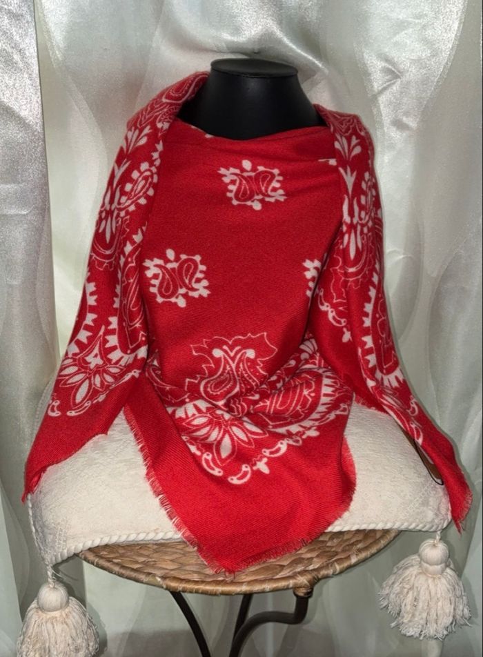 Composition : 80 % viscose, 20 % laine • Dimensions : 110 x 110 cm Couleur rouge