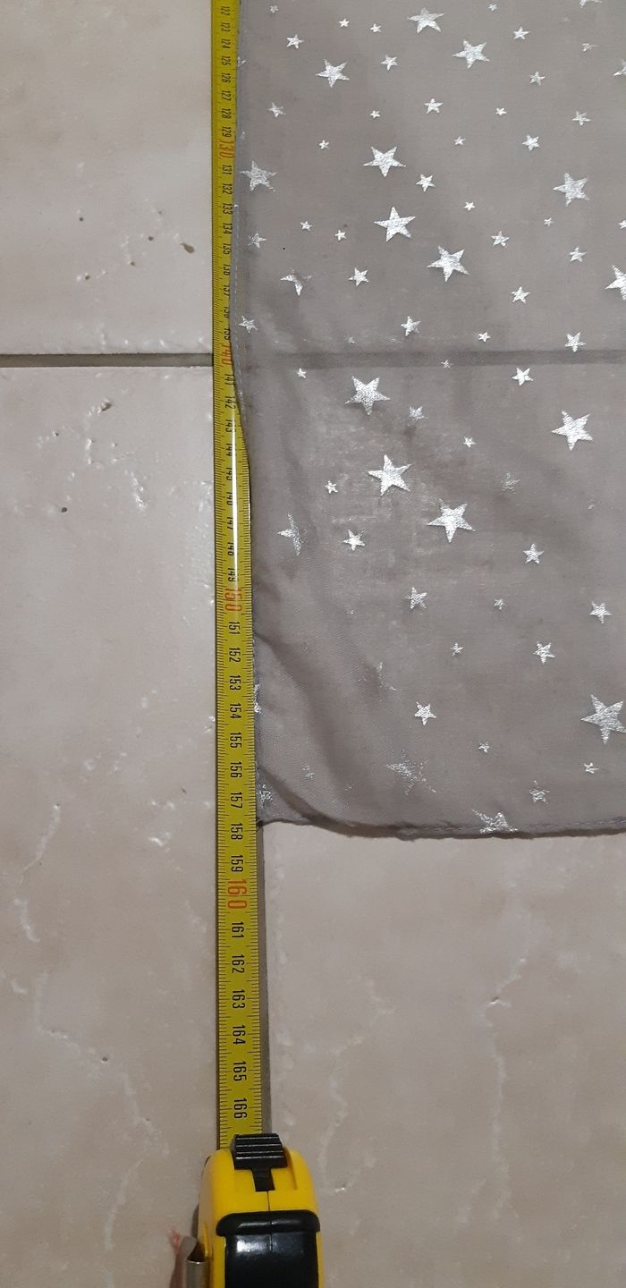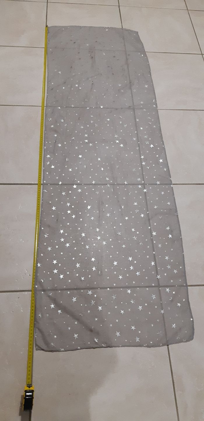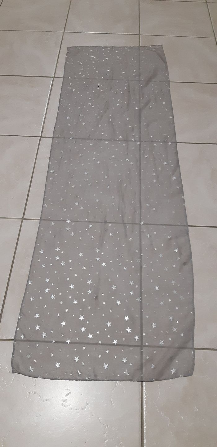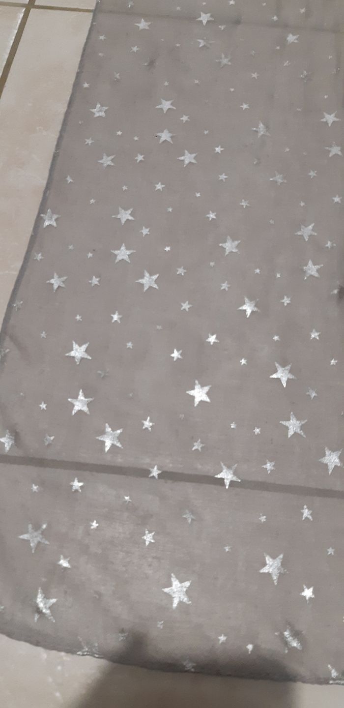 Foulard enfant Gémo Gris clair avec étoiles argentées Très bon état J'ai un autre foulard tape à l'oeil mais aussi des écharpes, des vêtements ainsi que des jeux. Je sais des réductions dès 2 articles achetés.
