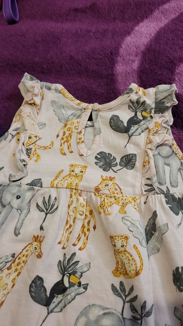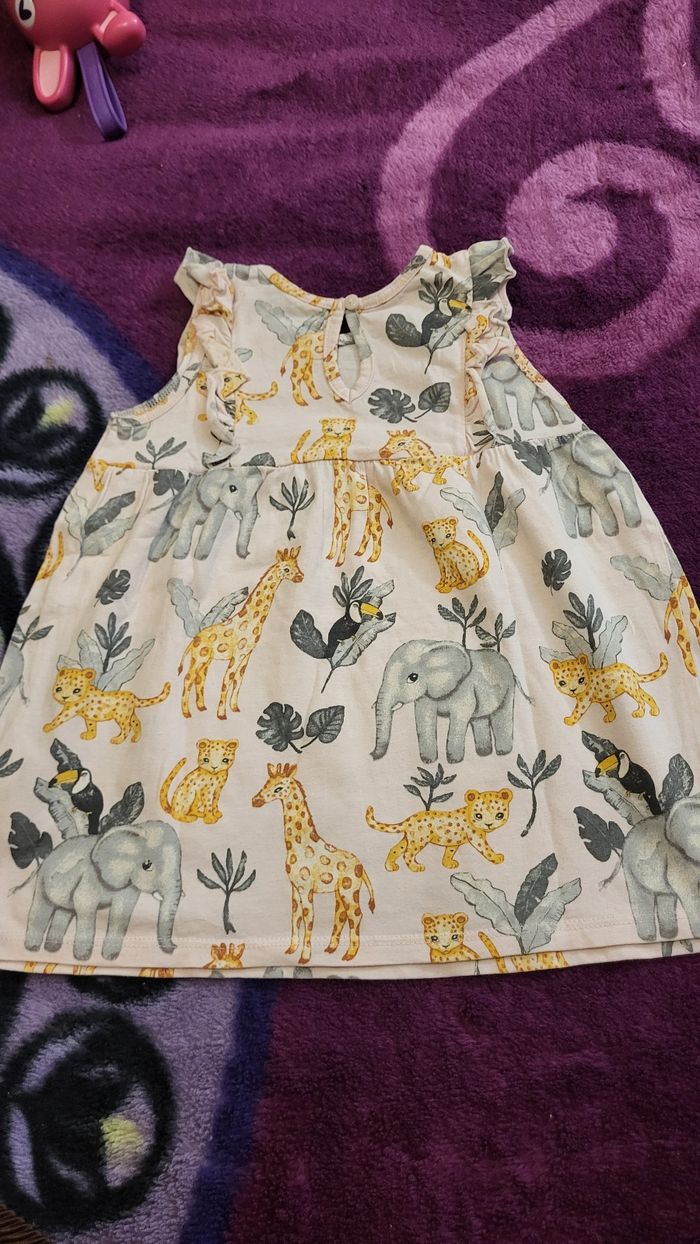 Robe bébé manches courtes – 9/12 mois (H&M) 100% coton, douce et légère. Motif animaux safari (éléphants, girafes, léopards, oiseaux). Manches courtes à volants, coupe évasée très confortable. Peu portée, état impeccable. #hm #robebébé #bébéfille #9_12mois #100coton #manchescourtes #étébébé #modebébé #beebs #petitprix