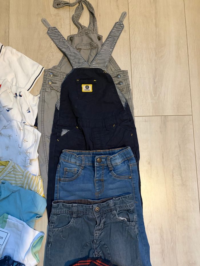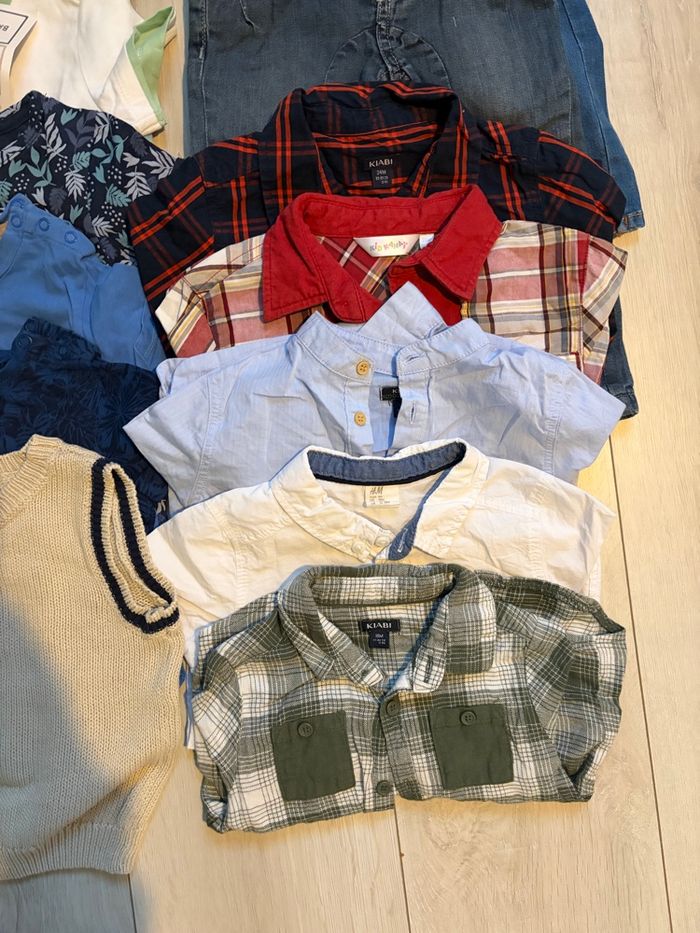 Lot de 43 vêtements pour 18 mois garçon - 2 jeans - 2 salopettes - 5 chemises - 1 pull en tricot sans manche. - 3 polos manches courtes - 5 pyjamas - 6 t-shirts - 13 bodys - 5 pulls - 1 gilets Maison non-fumeur Multi marques Vêtements stockés sous vide Ce lot contient du neuf avec étiquette à bon état