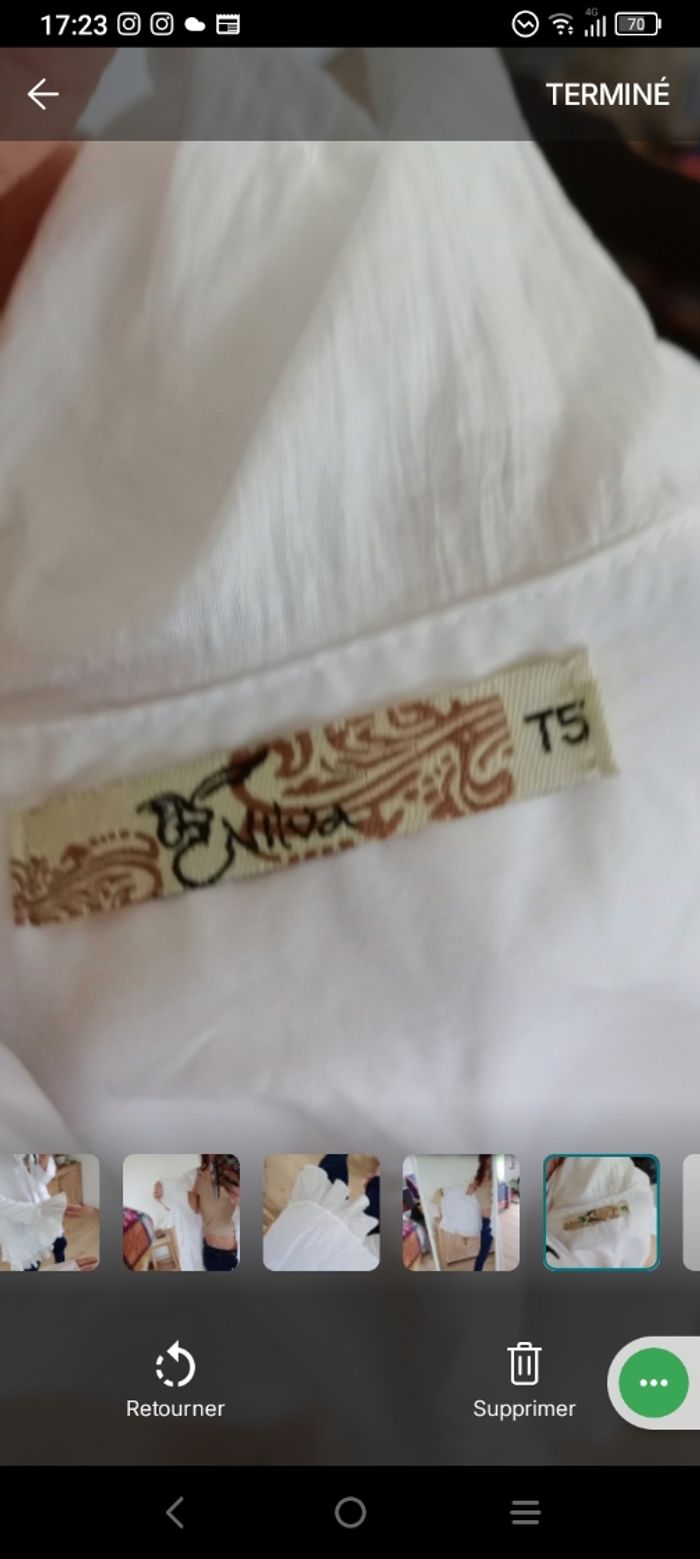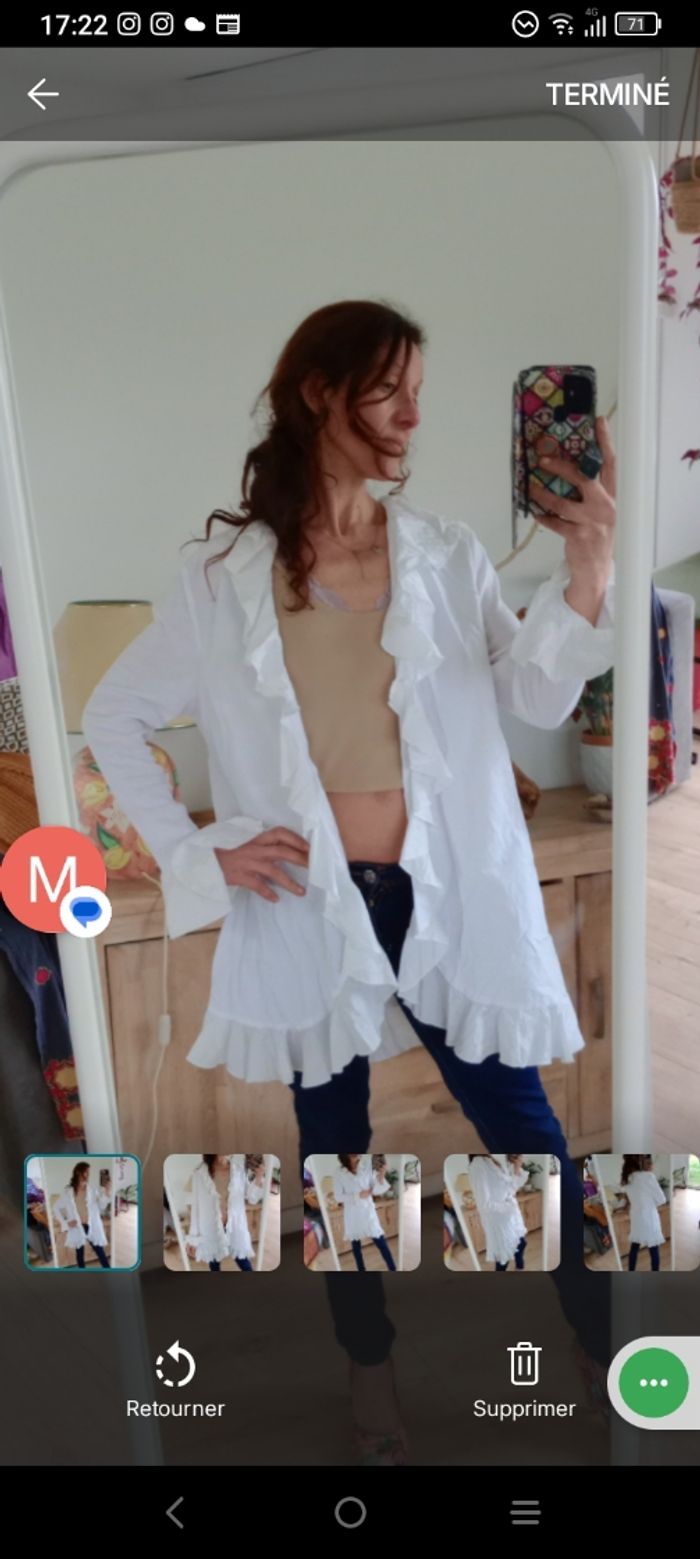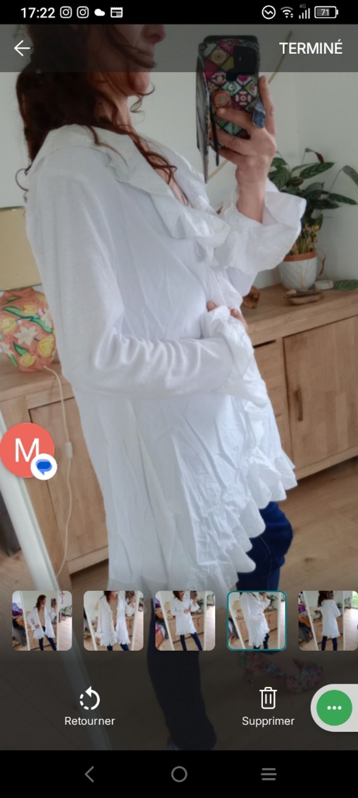 ​​Magnifique gilet tunique blanche (peut aussi se porter en gilet ouvert) de la marque Nilva, idéale pour un look romantique, bohème ou chic. 🥰💞 ​ ​Coupe : Fluide avec de superbes finitions à volants le long de l'encolure, sur le bas et aux poignets (manches évasées). ​Matière : Mélange confortable de 70% coton et 30% nylon, offrant un aspect légèrement texturé et une belle tenue. Bimatière, finement côté sur les manches ​ ​Style : ​Se porte aussi bien fermée ( avec une broche par exemple car il n'y a pas de bouton) en tunique sur un jean pour un effet "shabby chic" qu'ouverte comme un gilet léger sur un caraco. Parfait pour le printemps ou les soirées d'été. Épaule 45 cm longueur 88 cm aisselle 54 cm #calomomi_femme46 ​#boheme #chic #romantique #volants #shabbychic #nilva #tuniqueblanche #dentelle #vintagestyle #taille44 #taille46 #grandetaille #modefemme ​