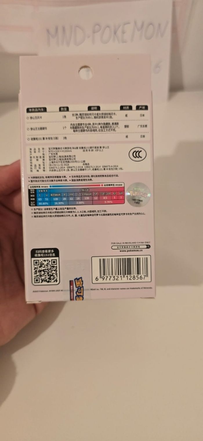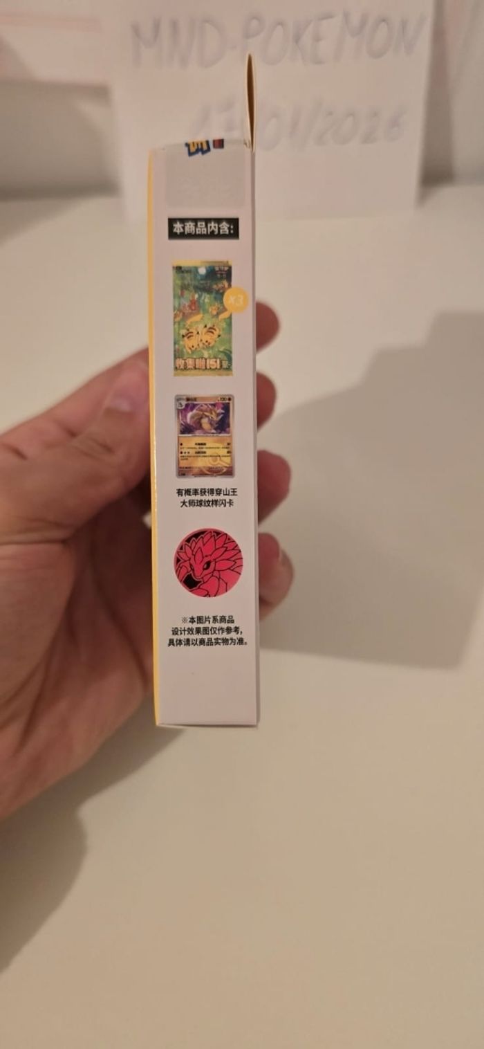 ​ Vends coffret officiel Pokémon issu de l'extension très prisée Pokémon 151. Il s'agit de l'édition exclusive de Chine continentale (Mainland China), réputée pour sa superbe qualité d'impression. ​État : Neuf et Scellé (Sealed). La boîte est intacte, jamais ouverte. ​Contenu du coffret : ​Un jeton (Coin) exclusif de collection (modèle aléatoire parmi 4 variantes possibles du personnage). ​Une carte promotionnelle brillante. ​3 boosters de l'édition Pokémon 151 (version chinoise). ​Détails importants : ​Produit 100% authentique avec hologramme officiel au dos. ​Idéal pour les collectionneurs de sets "151" ou de produits scellés (Sealed Collection). ​Envoi rapide et très soigné (protection bulle garantie). ​Mots-clés : #Pokemon #Pokemon151 #TCG #Collection #PokemonCards #Sealed #Neuf #PokemonChinois