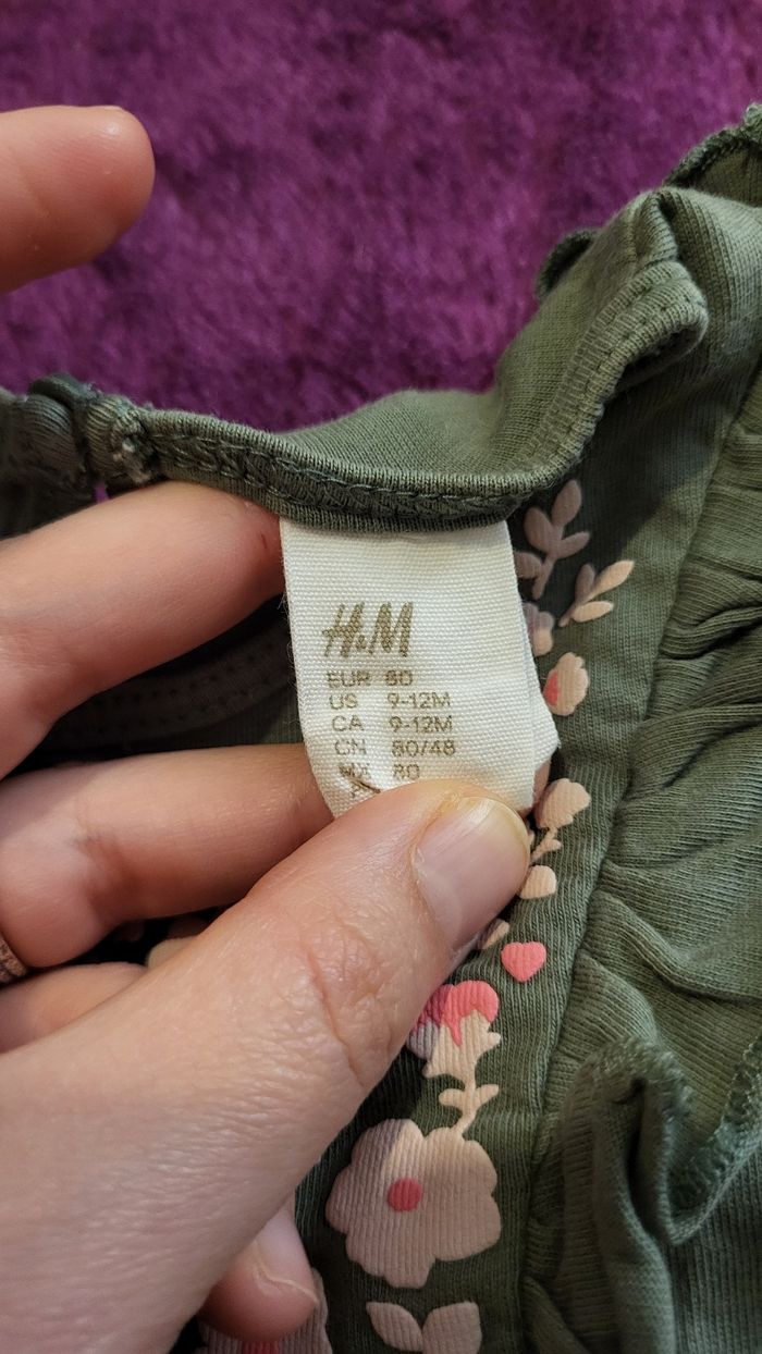 Robe bébé – 9/12 mois (H&M) 100% coton, douce et légère. Couleur vert olive avec motif fleurs roses. Manches courtes à volants, coupe évasée très confortable. Très bon état, peu portée. #hm #robebébé #bébéfille #9_12mois #100coton #manchescourtes #étébébé #modebébé #beebs #petitprix