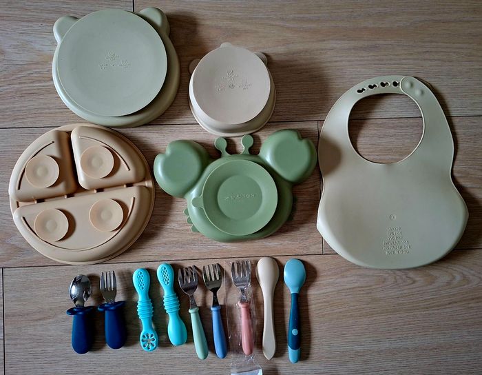 Lot de 3 assiettes avec ventouses et 1 bol ventouse. Un bavoir en silicone ainsi que des fourchettes et cuillères.