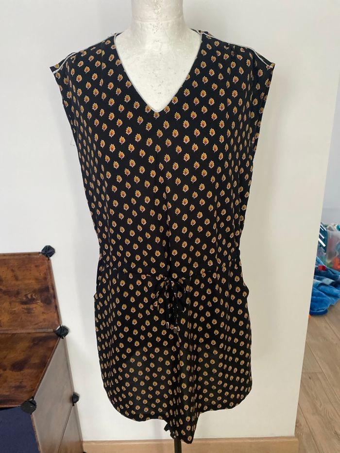 Jolie robe Zinka taille S, noire avec petits motifs colorés. ✔️ Coupe fluide et confortable ✔️ Lien à la taille pour ajuster la silhouette ✔️ Style bohème chic, idéale au quotidien ✅ Taille : S (convient 36/38, petit 40 possible) ✅ État : Très bon état ✨ Facile à porter avec sandales, bottines ou baskets.