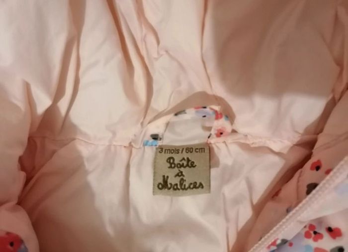 Manteau rose, taille 3 mois, marque Boîte à malices, en excellent état.