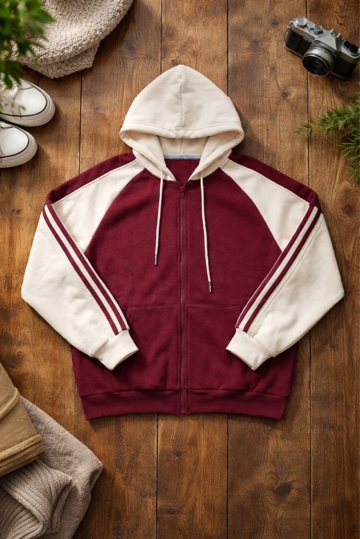 Sweat Hoodie Zippé Oversized Bordeaux & Beige – Style Vintage Campus – Taille M