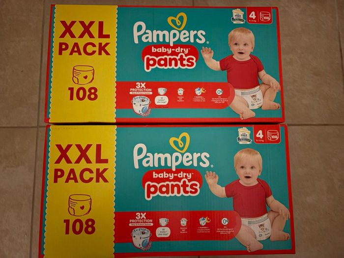 Vends 2 cartons de couches Pampers Baby Dry Pants Taille 4 (216 couches au total) Neuf. Jamais déballé