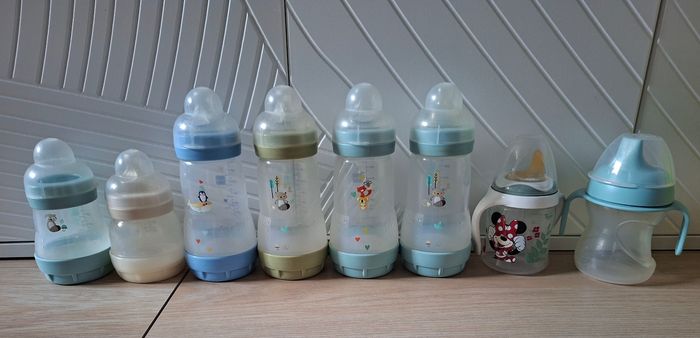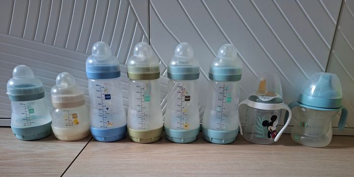 Lot de 6 biberons Mam anti colique et 2 biberons d'apprentissage. Les biberons sont vendus sans tétines.