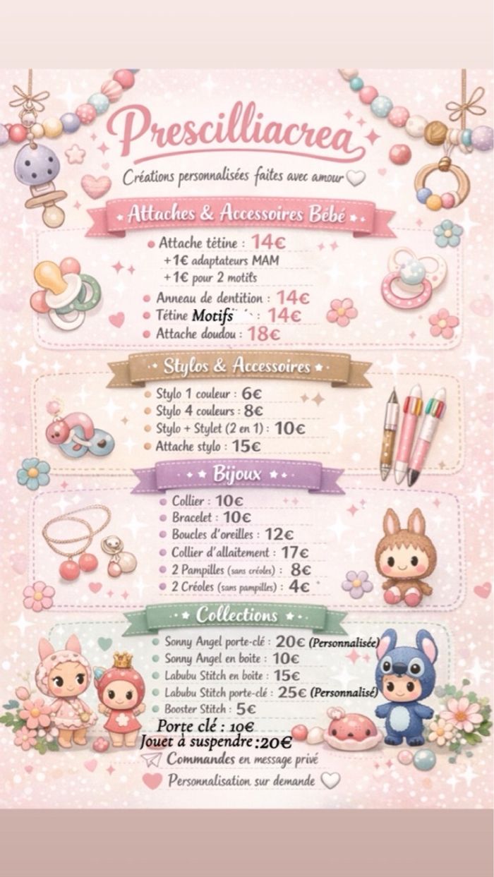 ⚠️je vous ferais une autre annonce avec vos articles ⚠️ •💕 bonjour, je suis créatrice déclarée je réalise plein de créations fait main avec amour 🫶🏼 💕 •💕 ma page fb : Prescilliacrea 💕 •💕les créations sont fait et expédié le jours même ou le lendemain💕 •💕 le prix varie selon les créations 💕