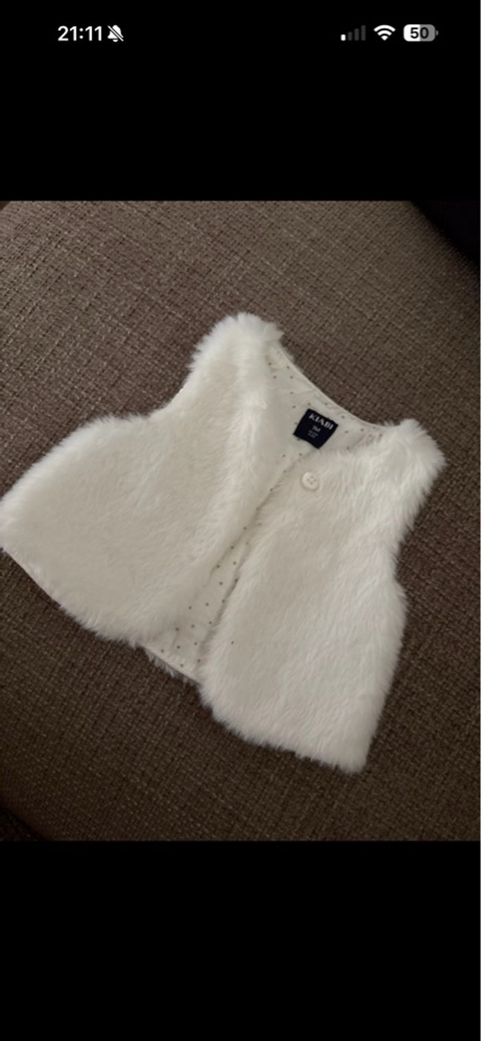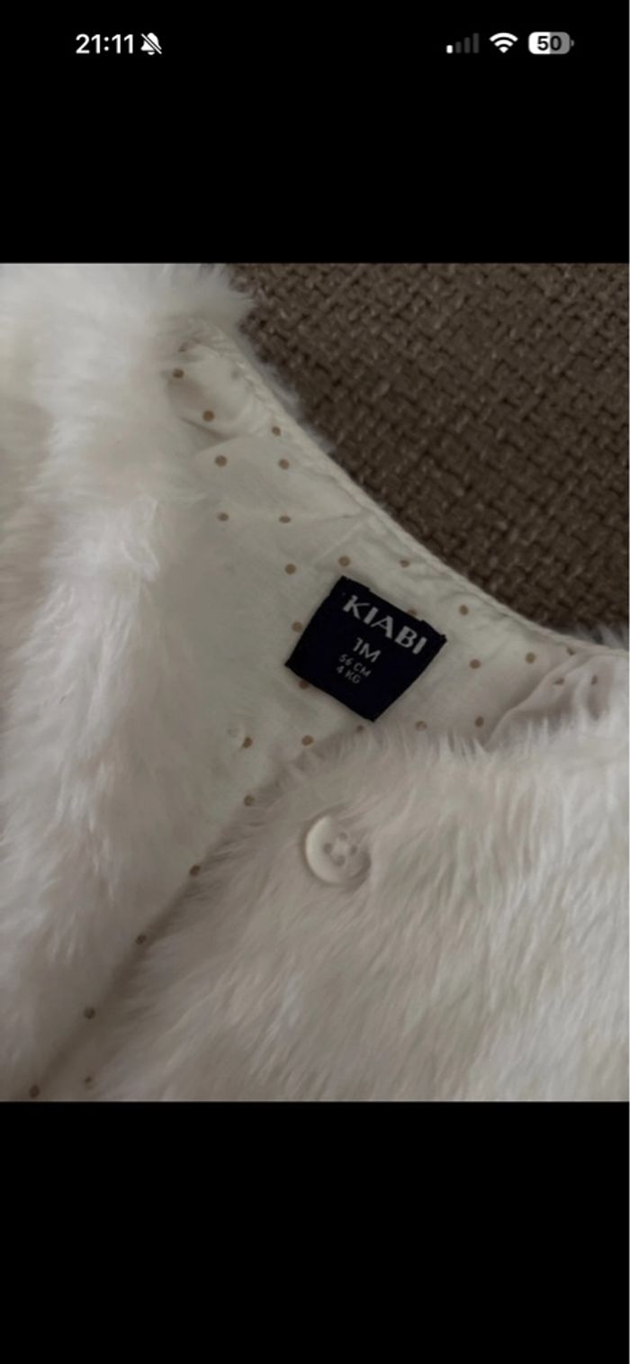 Vend fourrure Kiabi blanc en taille 1 mois aucune tache, propre et soigneusement lavés avec la lessive Persavon à l’abricot