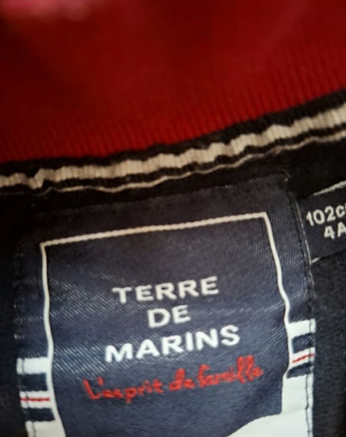 ​⚓ Veste Zippée Marine & Bordeaux - Terre de Marins - 4 ans ​Description : Très jolie veste de jogging zippée de la marque Terre de Marins, fidèle à son style nautique et authentique. Parfaite pour la mi-saison ou pour les journées d'école un peu fraîches. ​Marque : Terre de Marins. ​Taille : 4 ans (102 cm). ​Couleur : Bleu marine profond avec finitions contrastées rouge bordeaux (poignets et intérieur du col). ​Détails : ​Broderie thématique "Voile" sur la poitrine. ​Fermeture éclair blanche intégrale (parfait état). ​Deux poches latérales pratiques. ​Poignets et bas de veste élastiqués.​Deux poches latérales pratiques. ​Poignets et bas de veste élastiqués. ​État : Très bon état, bien entretenue. ​ ​📦 Infos pratiques : ​ ​Envoi rapide et soigné via le transporteur de votre choix 📦.