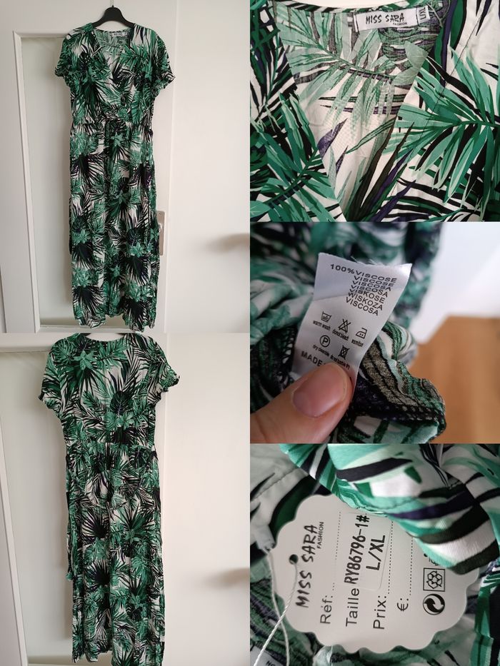 Robe mi-mollet tropicale Miss Sara – Taille L/XL – 100% viscose Superbe robe longue à imprimé feuillage tropical vert, noir et blanc. Matière 100% viscose, fluide et légère, parfaite pour l’été. Encolure en V, manches courtes et taille ajustable avec lien à nouer. Coupe longue et confortable qui met la silhouette en valeur. Idéale pour les vacances, une journée ensoleillée, une sortie estivale ou même une soirée d’été. 📏 Taille : L/XL 🌿 Matière : 100% viscose 🎨 Couleurs : vert, noir et blanc ✨ État : neuf avec étiquette Une robe facile à porter qui apporte immédiatement une touche fraîche et estivale. 👗 Idées de looks – Avec des sandales plates en cuir pour un look bohème – Avec des baskets blanches pour un style casual chic – Avec une ceinture fine pour structurer davantage la taille – Avec un panier en osier pour un esprit vacances – Avec une veste en jean pour les soirées plus fraîches #robeete #robefemme #robemaxi #imprimetropical #viscose #misssara #tailleL #tailleXL #lookestivale #modefemme #secondevie #styleboheme