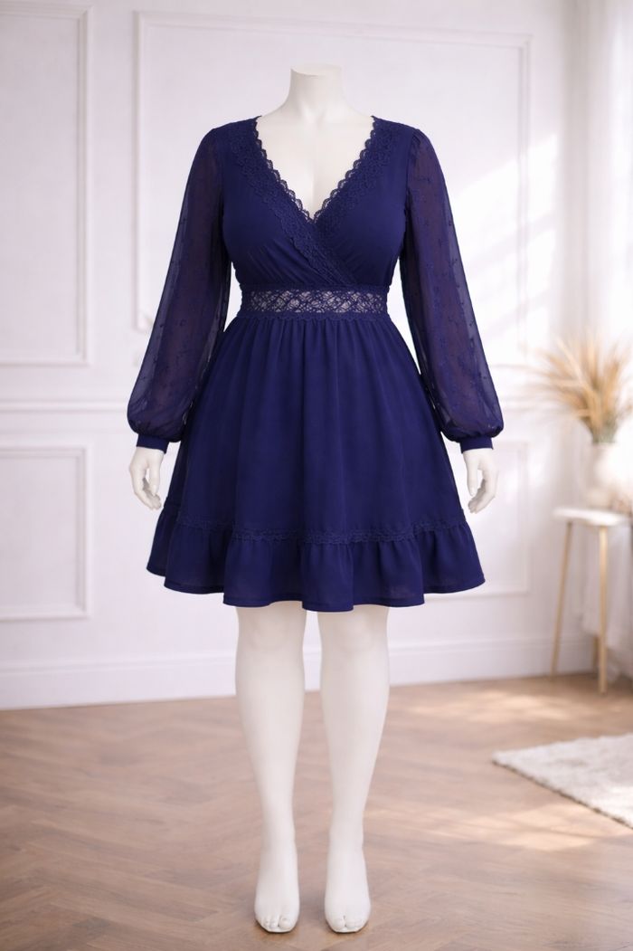 Robe manches longues bohème chic bleue marine Femme taille 54 ✴️ Manches longues légèrement bouffantes ✴️ Col en V cache-coeur festonnée ✴️ Couleur => Bleu marine ✴️ Taille marquée d une bande de dentelle ajourée ✴️ Poignets resserrés ✴️ Ourlet volanté ✴️ Taille élastiquée smockée dans le dos ✴️ Composition => 93 % polyester 7 % elastanne ✴️ Longueur -> 102,5 centimètres ✴️ Mesure épaules à épaules -> 43 centimètres ✴️ Tour de poitrine => 130 centimètres ✴️ Tour de taille => 110 à 138 centimètres